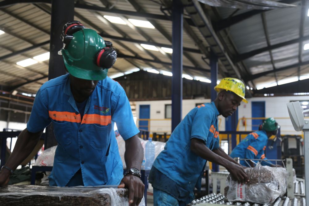 2024年6月10日,在科特迪瓦南部城镇达布郊区,工人们在美兰橡胶加工厂对成品橡胶进行打包。中国加工厂帮助科特迪瓦橡胶增加产品附加值,提高胶农收入。