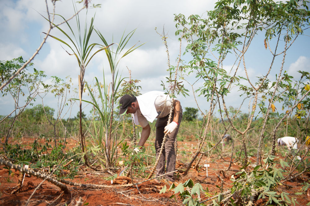2020年3月24日,在位于海南省的中国热带农业科学院的一处基地,来自埃及的副教授哈马达·穆罕默德·哈桑·阿卜杜拉参加中国热科院热带生物技术研究所木薯育种团队开展的木薯选育新技术培训。
