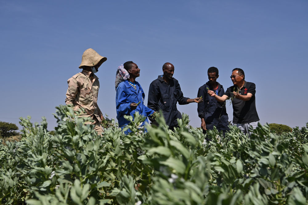 2023年9月27日,在位于厄立特里亚阿斯马拉的农业技术援助项目示范地,中国援厄第三期高级农业专家组豆类作物专家刘运民(右一)与当地农户交流。为推动厄立特里亚农业产业发展,中国农业农村部已派出多批专家在厄立特里亚开展涉及豆类作物、果树园艺、油料等领域的技术援助工作。