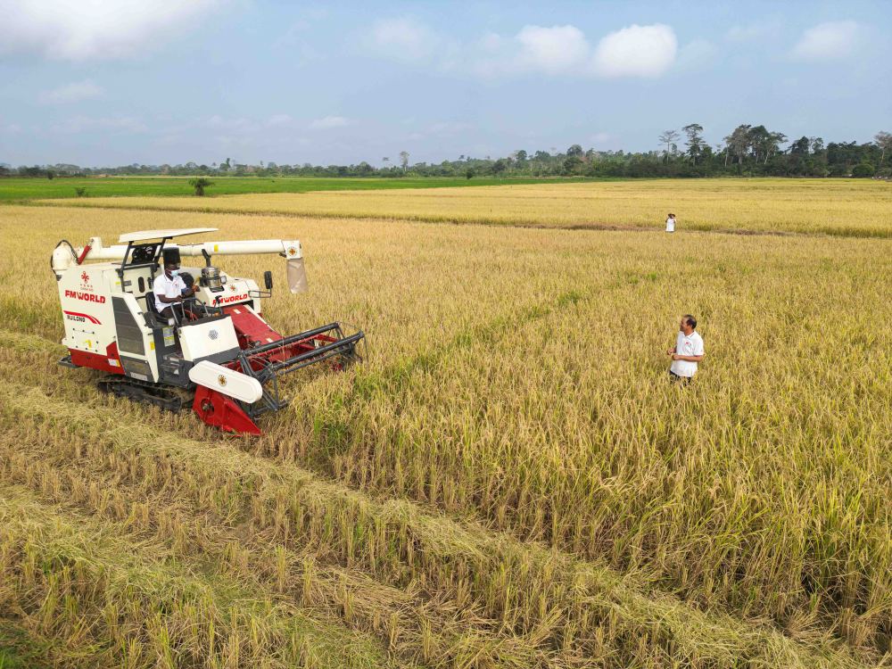 2024年1月8日,在科特迪瓦南部迪沃省格格杜垦区,中国援科农业技术合作组组长郭长友(右一)指导稻农驾驶收割机收割水稻(无人机照片)。格格杜垦区是中科两国农业合作示范基地,也是科特迪瓦全国闻名的水稻种植基地。