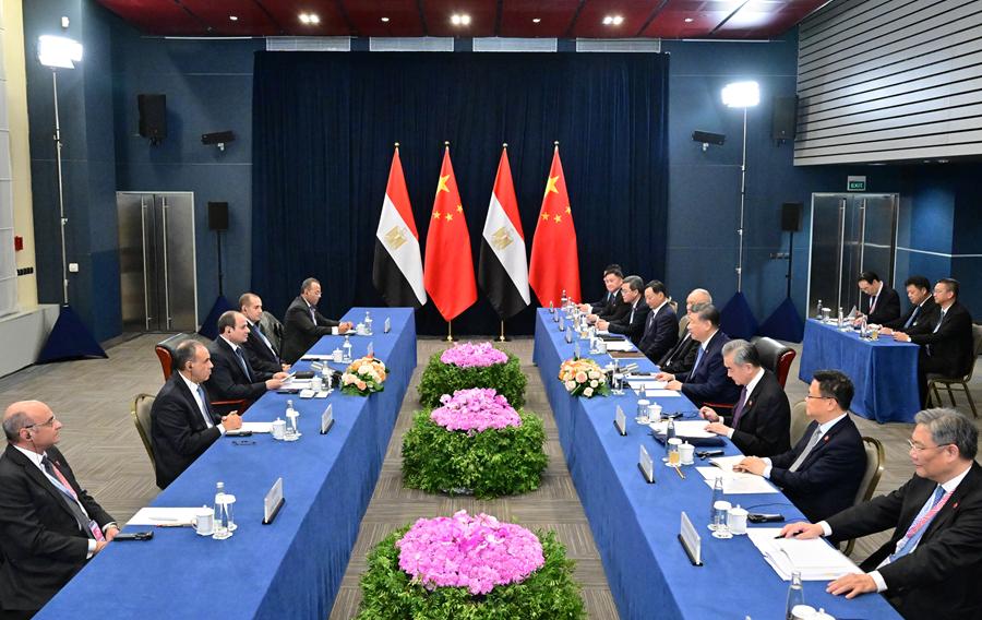 习近平祝贺并欢迎埃及首次作为正式成员参加金砖国家领导人会晤。习近平指出,今年是“中埃伙伴年”和两国建立全面战略伙伴关系10周年。中方坚定支持埃及维护国家主权、安全、发展利益,愿同埃方做守望相助的真诚朋友、携手发展的亲密伙伴。双方要继续坚定相互支持,巩固政治互信,深化务实合作,高质量共建“一带一路”,密切人文交流,推动双边关系朝着构建面向新时代的中埃命运共同体目标持续迈进。中方也愿同埃方加强协调,推动“大金砖合作”行稳致远,进一步提升全球南方影响力和发言权,维护发展中国家共同利益。