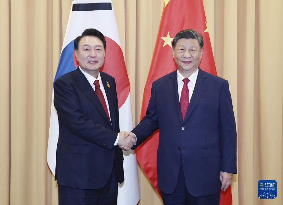 尹锡悦表示,两年前我同习近平主席在巴厘岛进行会晤以来,双方各领域交流合作有序发展。中国是世界经济增长的重要引擎,为应对世界面临的问题作出重要贡献。韩国视中国为重要合作伙伴,希望本着相互尊重精神,秉持建交初心,推动韩中战略合作伙伴关系不断发展,更好应对共同挑战,促进地区和平与稳定。韩方尊重一个中国的政策不会改变,希望参与中国现代化进程,进一步紧密两国经济贸易合作。欢迎中方给予韩国公民免签待遇,愿同中方密切人文交流,增进两国民间友好。韩方愿同中方密切在亚太经合组织等多边机制沟通合作,共同维护多边主义和自由贸易。