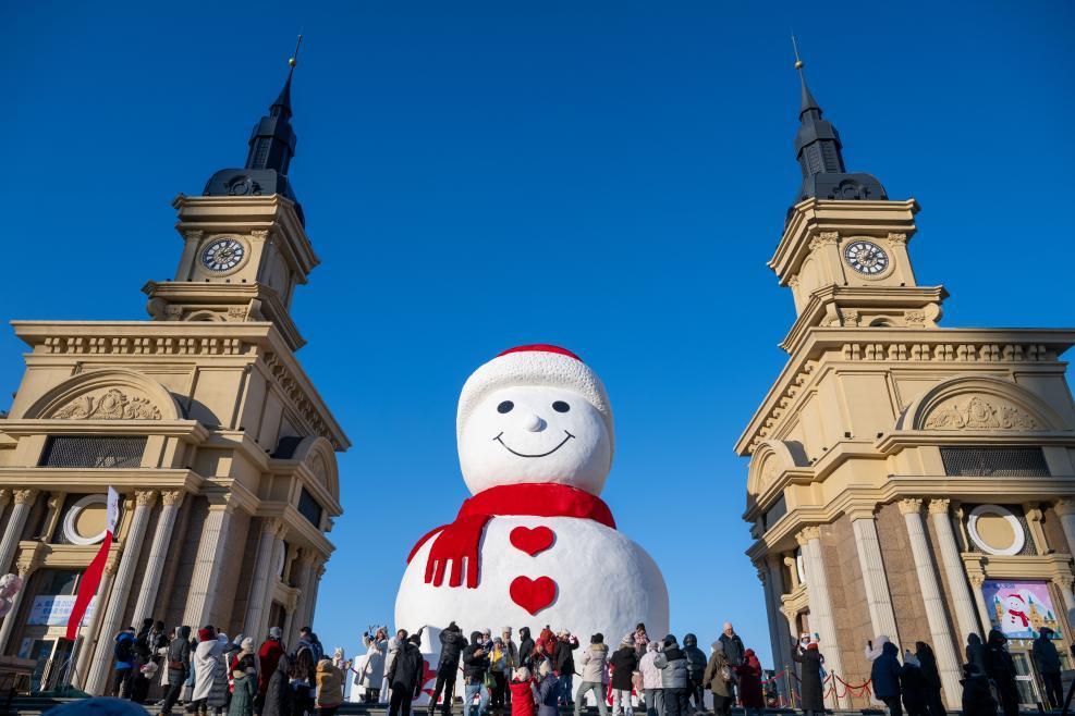 哈尔滨街头巷尾张灯结彩,在百年老街中央大街,火红灯笼高高挂,造型各异的锦鲤花灯栩栩如生;吉祥物“滨滨”“妮妮”向游人问好;在太阳岛雪博会,扎着红围巾、身贴福字的“雪韵福娃”喜气洋洋。