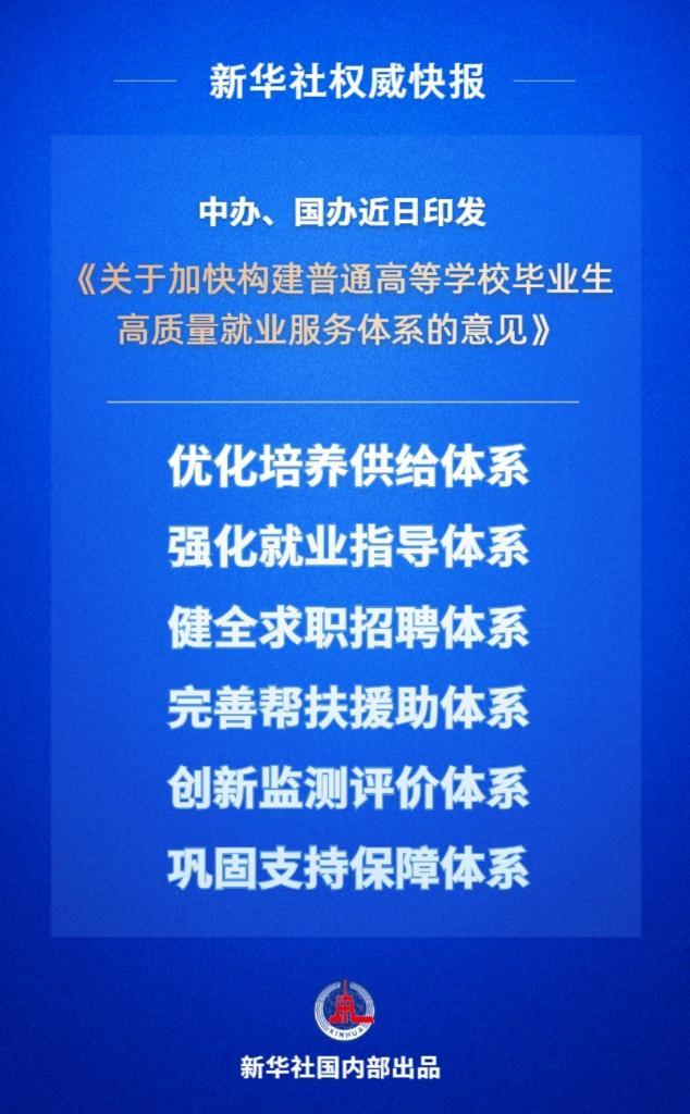 近日,中共中央办公厅、国务院办公厅印发《关于加快构建普通高等学校毕业生高质量就业服务体系的意见》,对构建高质量就业服务体系促进高校毕业生高质量充分就业有关工作作出部署。
