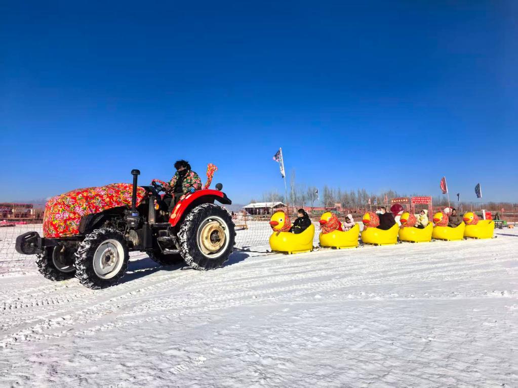 稻渔空间乡村生态观光园里,稻田褪去金黄,化身冰雪乐园。游客坐着雪圈从人造雪坡顶俯冲而下,雪地摩托呼啸驰过,尖叫声、欢笑声此起彼伏。