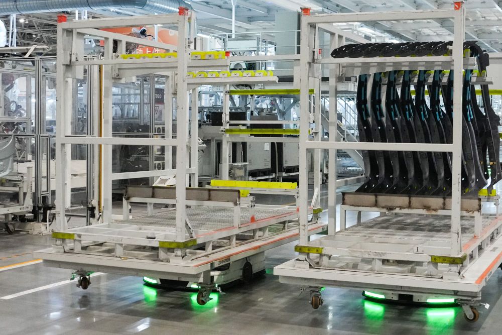 从研发制造到测试应用,北京发挥汽车产业长期积累,积极拥抱新品牌、新技术,新模式,新能源汽车产业蓬勃发展,产业链供应链不断巩固完善。这是自主移动机器人在北京小米汽车工厂搬运物资(2025年6月16日摄)。