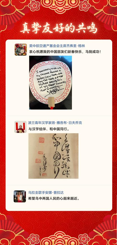 新春祝福跨越山海,合作脚步马不停蹄。在中国的“朋友圈”里,来自世界的每一句问候、每一份期许,汇聚起携手奋发、笃行致远的美好心愿,昭示着和平发展、合作共赢的共同选择。