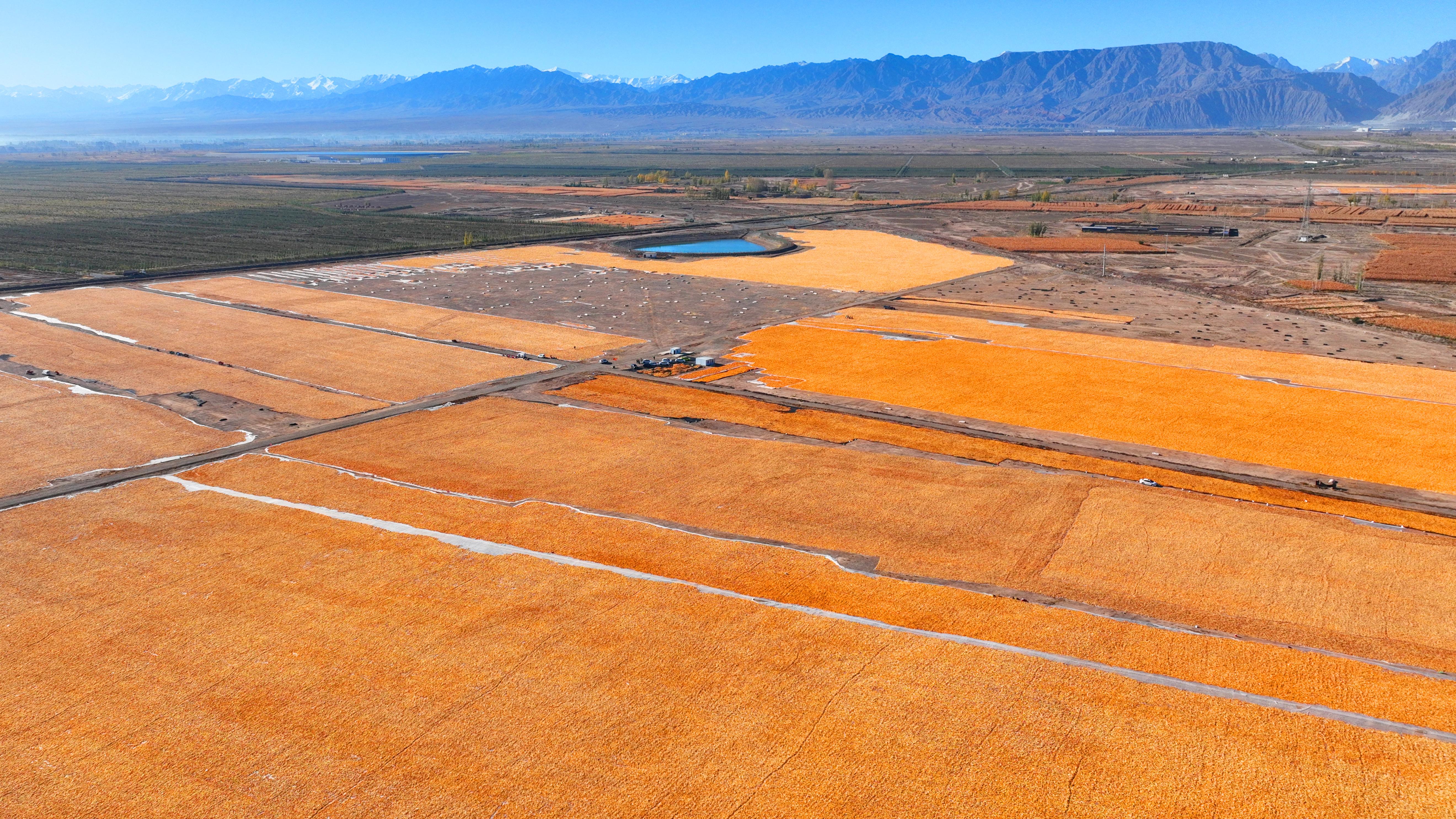 At the end of autumn and the beginning of winter, the endless Gobi Desert in the Hexi Corridor is covered with patches of golden yellow. These are corn seeds being dried by farmers.