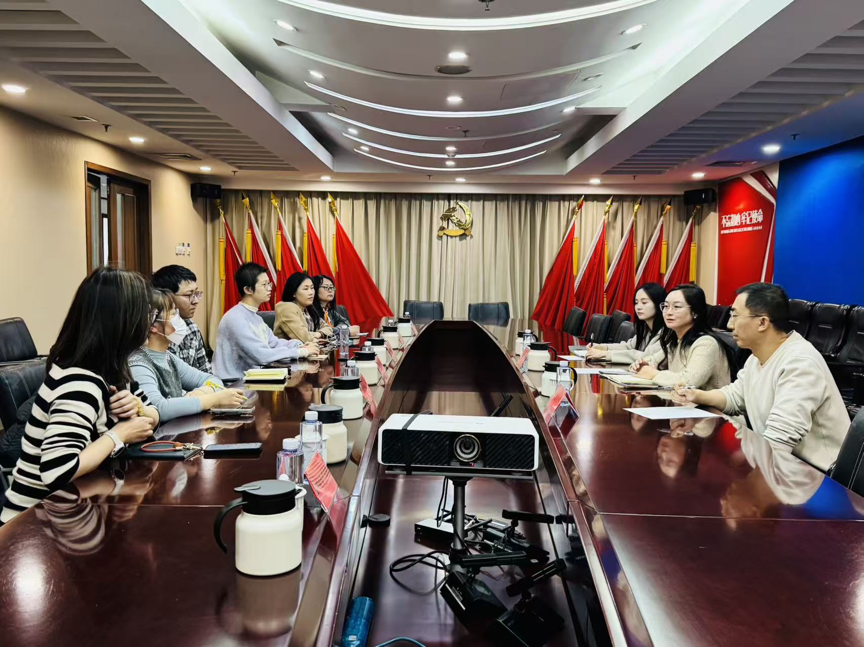 (图为记者一行人在朝阳区政务服务中心调研座谈)