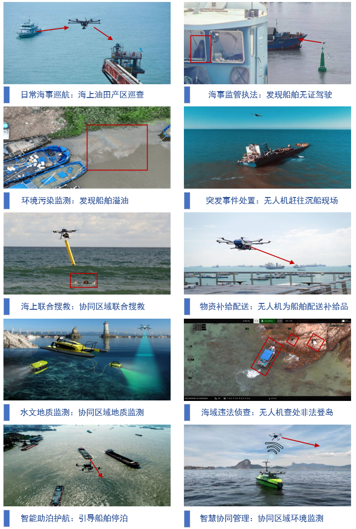 本成果主要应用场景包括:海上监管与执法场景,包括日常海事巡查、海事监管执法、海洋环境污染监测;海上智慧边防场景,包括海域违法行为侦查与监测、海上目标跟踪与协同处置;海上交通运营与服务场景,包括海上物资补给与配送、智能助泊与护航保障;海上应急与救援场景,包括突发事件应急处置、海上联合搜救(SAR)、跨海物资快速投送、人员跨海紧急撤离等。