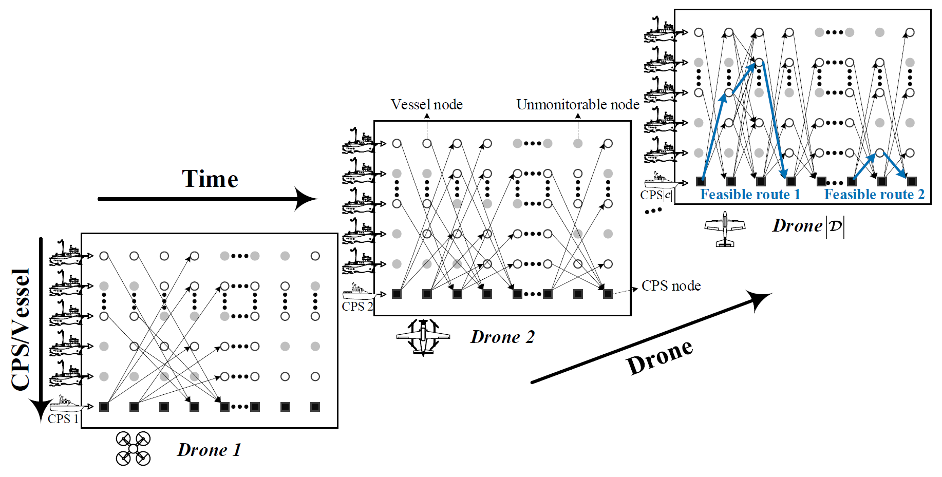 本成果由大连海事大学交通科学课题组自主研发,面向海上低空经济发展需求,针对船舶与无人机(或直升机)在多任务、多约束环境下的协同运行问题,综合考虑时间窗口、任务优先级、航行安全、能耗约束及不确定性因素,构建多类型资源耦合优化模型,形成“精确算法+启发式算法+人工智能算法”的融合求解框架,基于列生成、Benders分解、分支定界、拉格朗日松弛等方法求解大规模组合优化问题;基于自适应大邻域搜索(ALNS)、禁忌搜索等启发式算法提升复杂场景下的求解效率;引入强化学习与深度学习方法,实现动态环境下的自适应调度与策略优化。