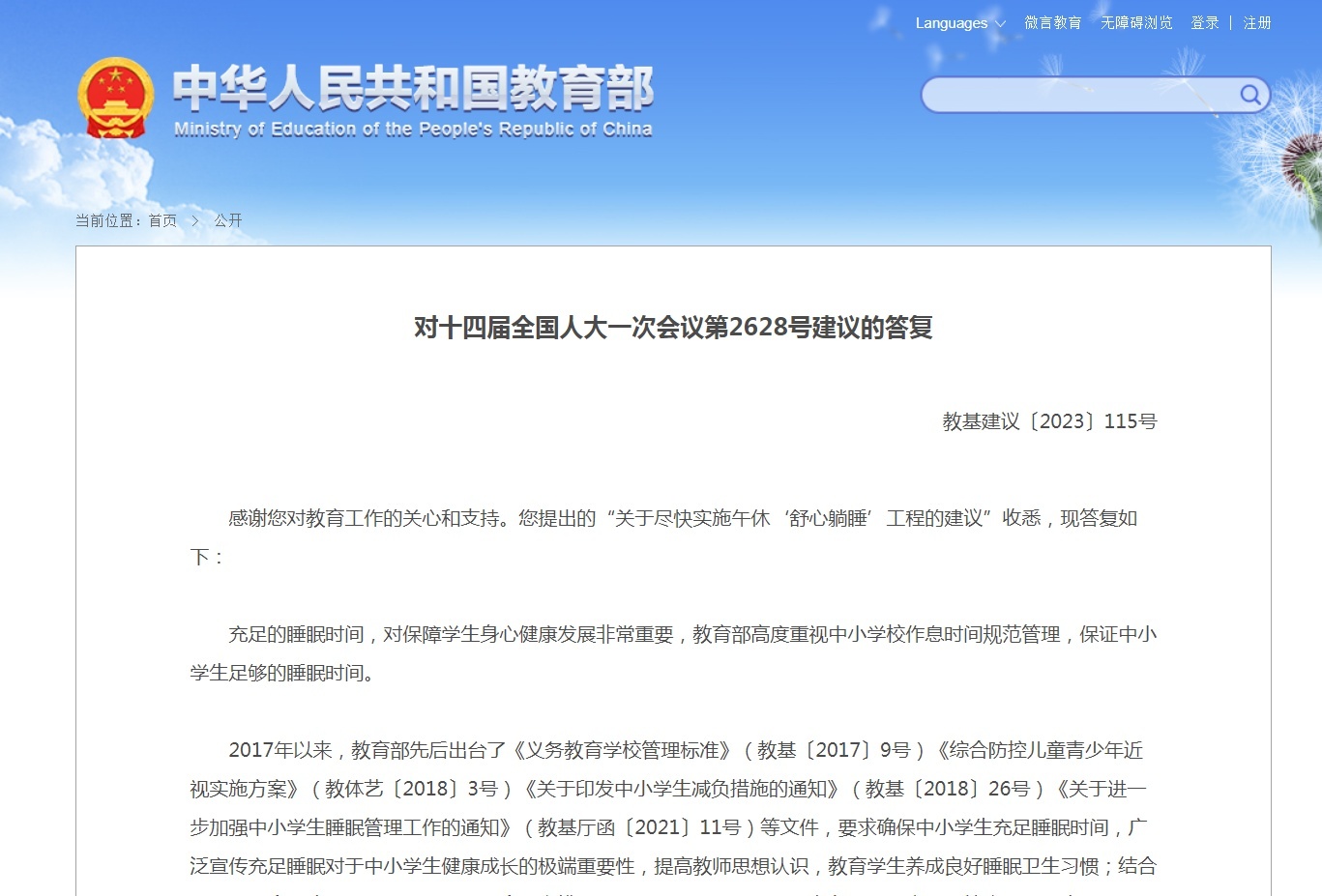 日前,教育部网站公布了对十四届全国人大一次会议第2628号建议的答复,针对“关于尽快实施午休‘舒心躺睡’工程的建议”,教育部表示,充足的睡眠时间,对保障学生身心健康发展非常重要。下一步将继续引导鼓励支持有条件的地方,统筹现有办学条件和设施设备,因地制宜创造学生午休条件,为学生身心健康发展提供有力保障。具体内容如下↓