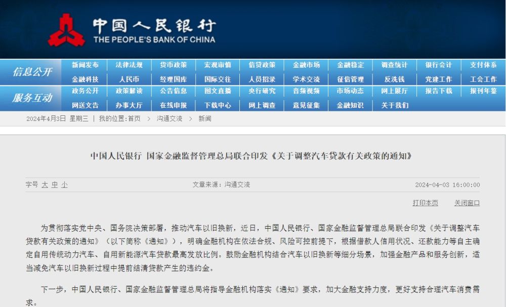 为贯彻落实党中央、国务院决策部署,推动汽车以旧换新,近日,中国人民银行、国家金融监督管理总局联合印发《关于调整汽车贷款有关政策的通知》(以下简称《通知》),明确金融机构在依法合规、风险可控前提下,根据借款人信用状况、还款能力等自主确定自用传统动力汽车、自用新能源汽车贷款最高发放比例。鼓励金融机构结合汽车以旧换新等细分场景,加强金融产品和服务创新,适当减免汽车以旧换新过程中提前结清贷款产生的违约金。