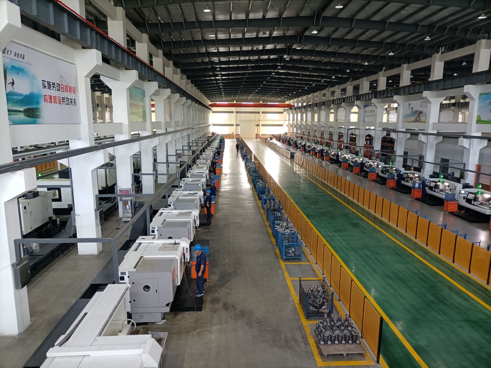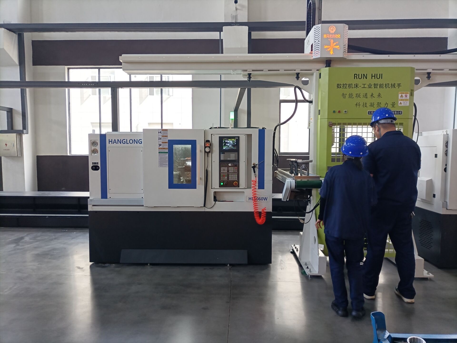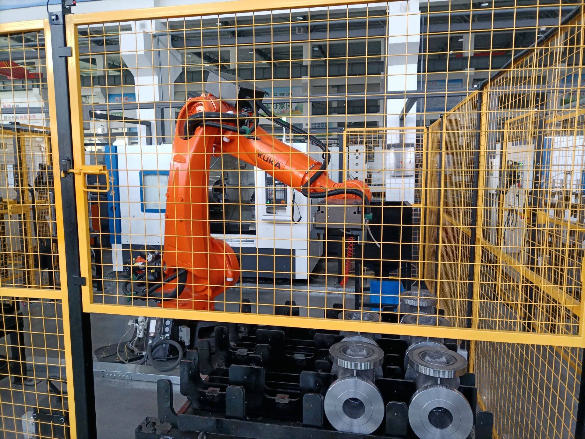 行走在公司车间,机器人与数控车床协作,生产效率提高了5倍以上。产品的一次合格率从以前的不足95%提高到了现在的99.9%。