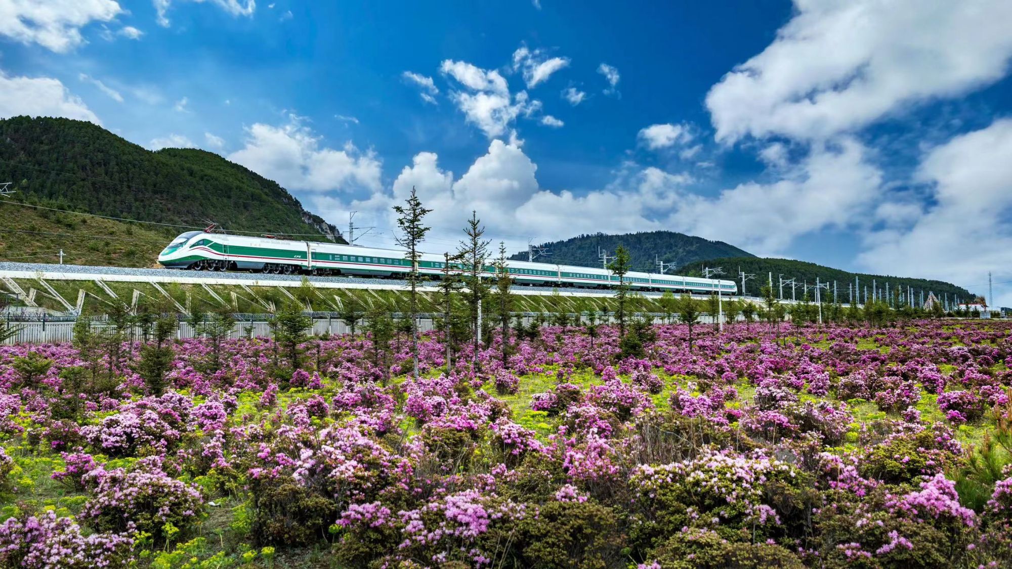 丽香铁路,满载旅客的复兴号动车组穿过杜鹃花海。徐章位 摄