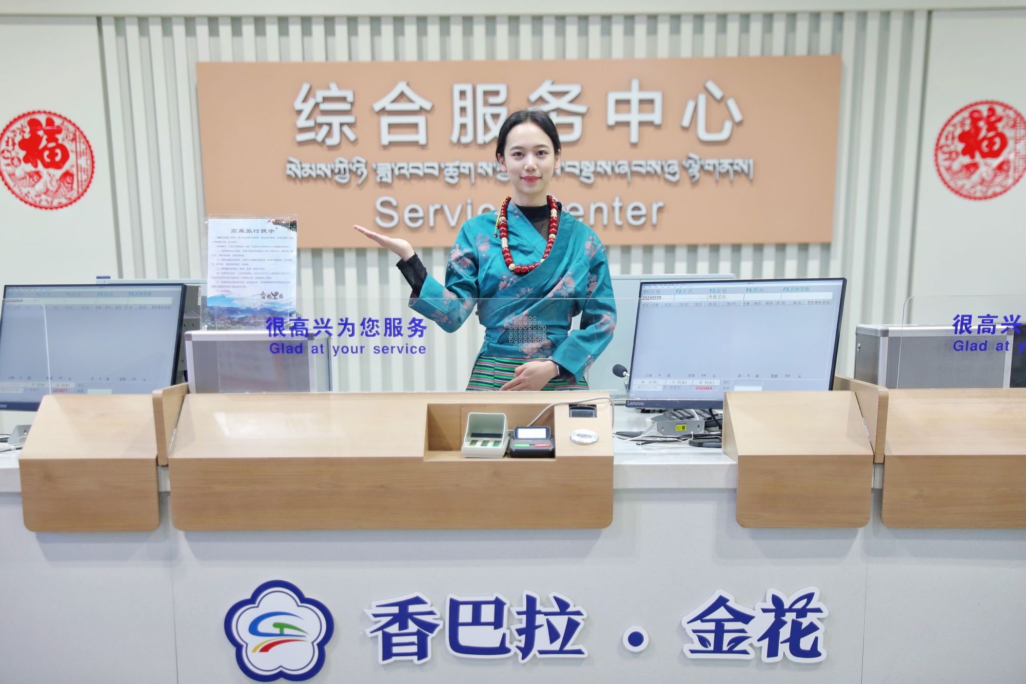 香格里拉站客运员身着民族特色服装迎接抵达列车。杨紫轩 摄