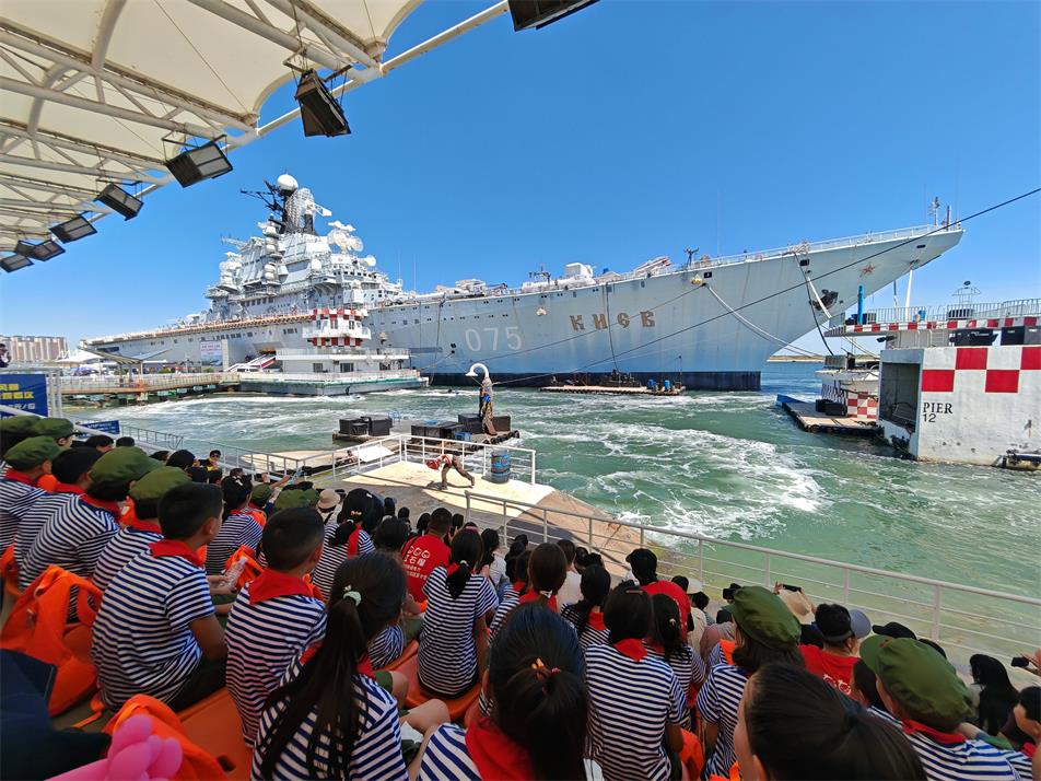 孩子们在天津航母主题公园观看水上表演。刘栋摄