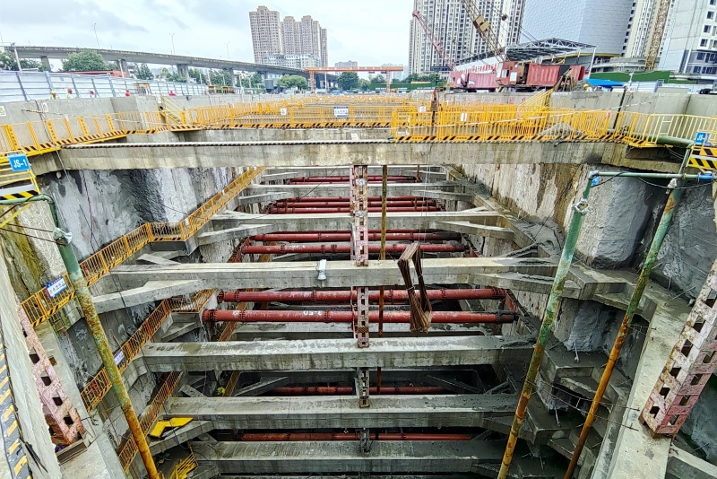 为保证基坑施工安全,项目部坚持“先撑后挖、分层分段开挖、严禁超挖”原则,严格控制分层开挖深度,限时架设支撑降低基坑变形风险。项目部遵循“掏槽探缝封钢板”原则,安排专业班组对地连墙接缝进行探挖、封钢板、灌浆,确保地连墙接缝安全。