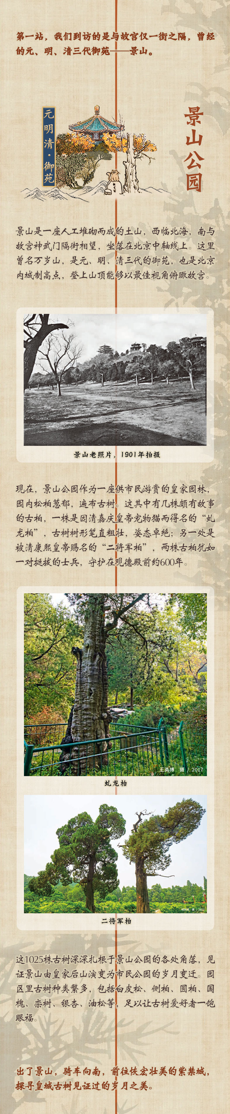 比如,景山公园是一座供市民游赏的皇家园林,园内松柏葱郁,遍布古树。目前,整个景山公园共有古树1025株,包括白皮松、侧柏、圆柏、国槐、栾树、银杏、油松等,可让古树爱好者一饱眼福。