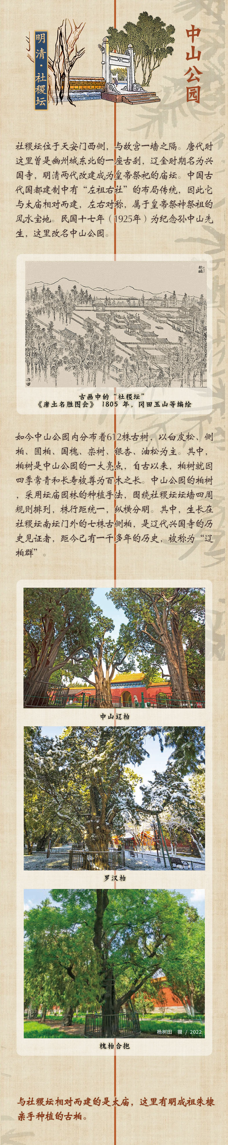 中山公园分布着612株古树,其中柏树是公园的一大亮点。自古以来,柏树就因四季常青和长寿被尊为百木之长。生长于社稷坛南坛门外的七株古侧柏,是辽代兴国寺的历史见证者,距今已有一千多年的历史,被称为“辽柏群”。