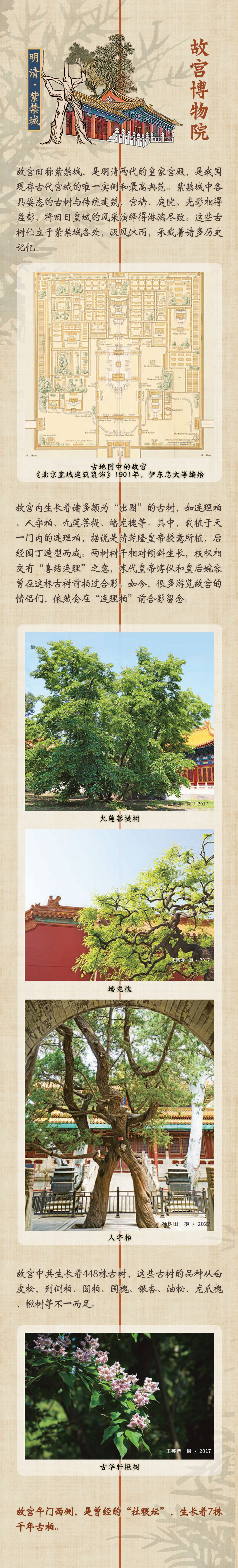 故宫内生长着诸多颇为“出圈”的古树,如连理柏、人字柏、九莲菩提、蟠龙槐等。故宫中448株古树的品种从白皮松到侧柏、圆柏、国槐、银杏、油松、龙爪槐、楸树等不一而足。