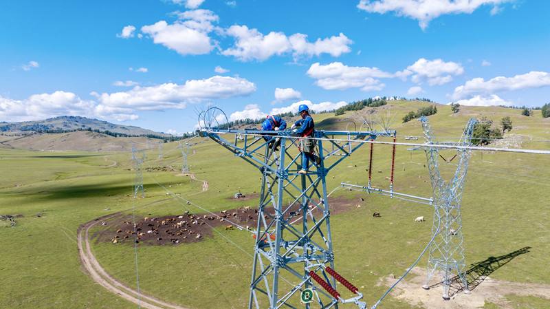 7月28日,国网阿勒泰供电公司员工对输电线路进行消缺,保障新能源送出。努尔别克·努尔曼 摄