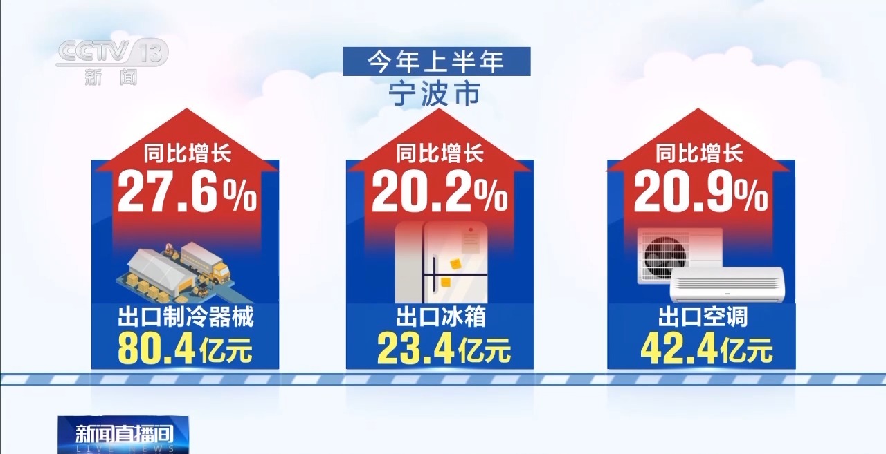 据统计,今年上半年,宁波市共出口制冷器械80.4亿元,同比增长27.6%,出口冰箱23.4亿元,同比增长20.2%,出口空调42.4亿元,同比增长20.9%。