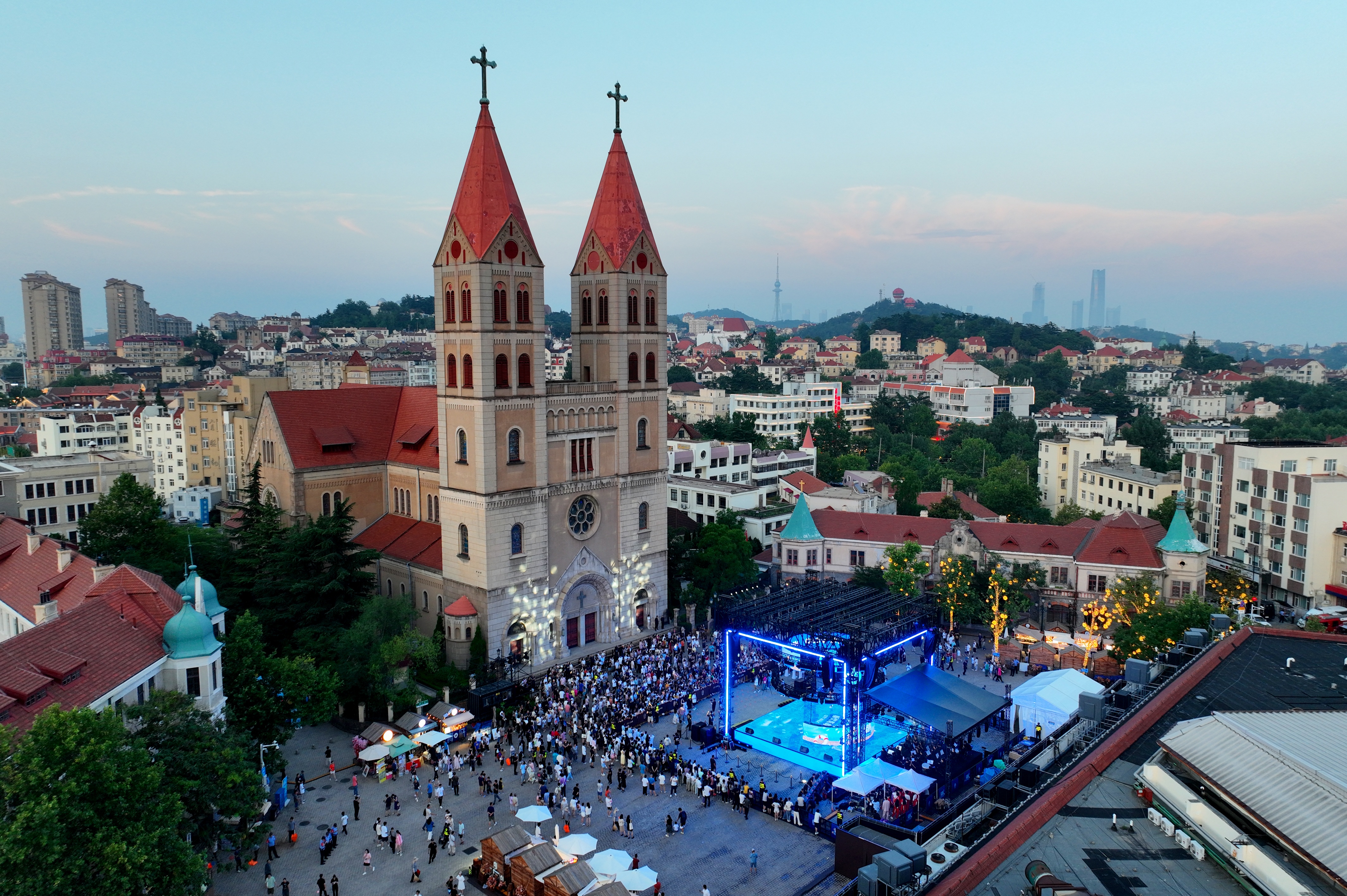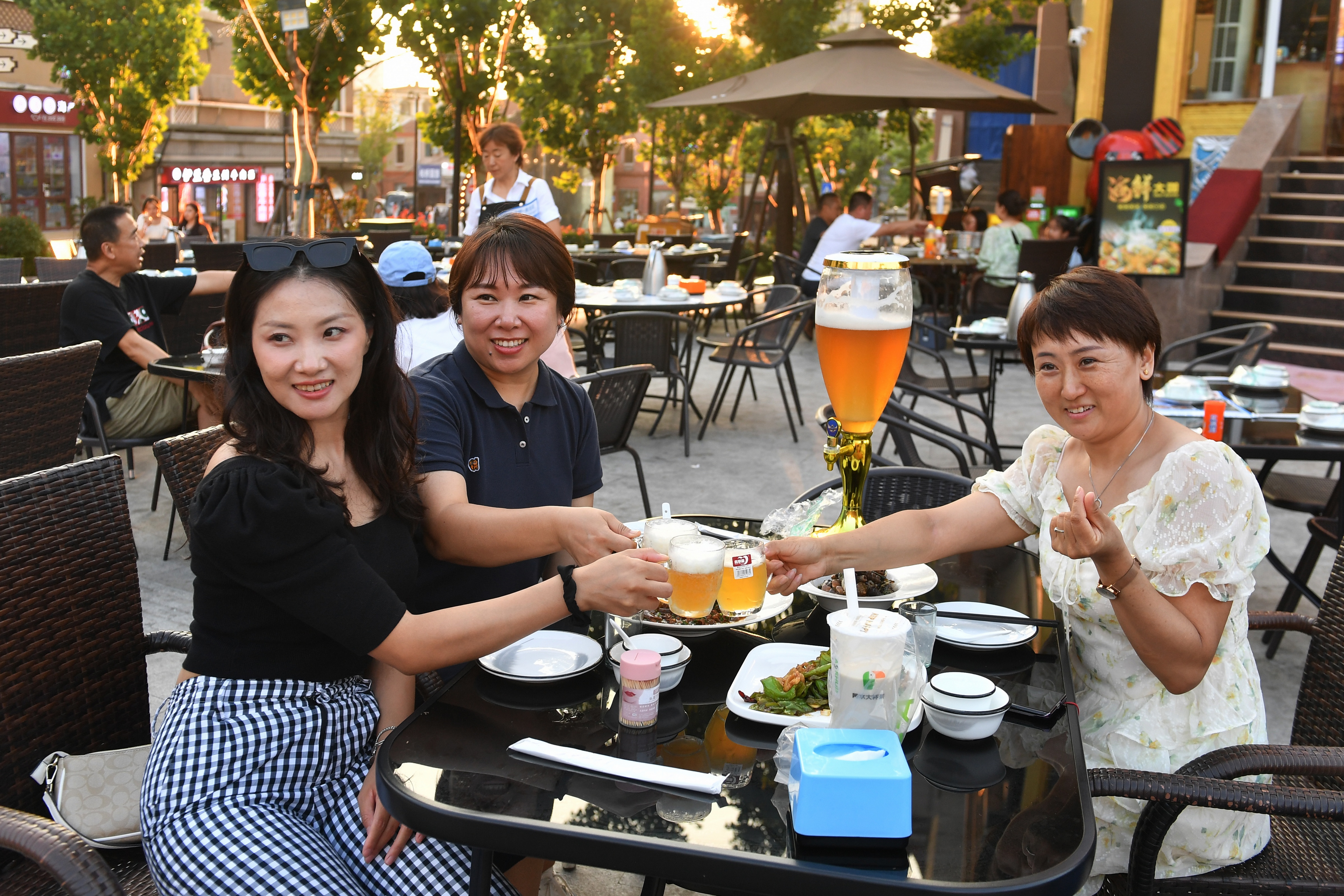 游客三五成群围坐一起,频频碰杯;年轻人手拿一杯啤酒,逛着潮流小店,感受青岛老城区的独特风情。
