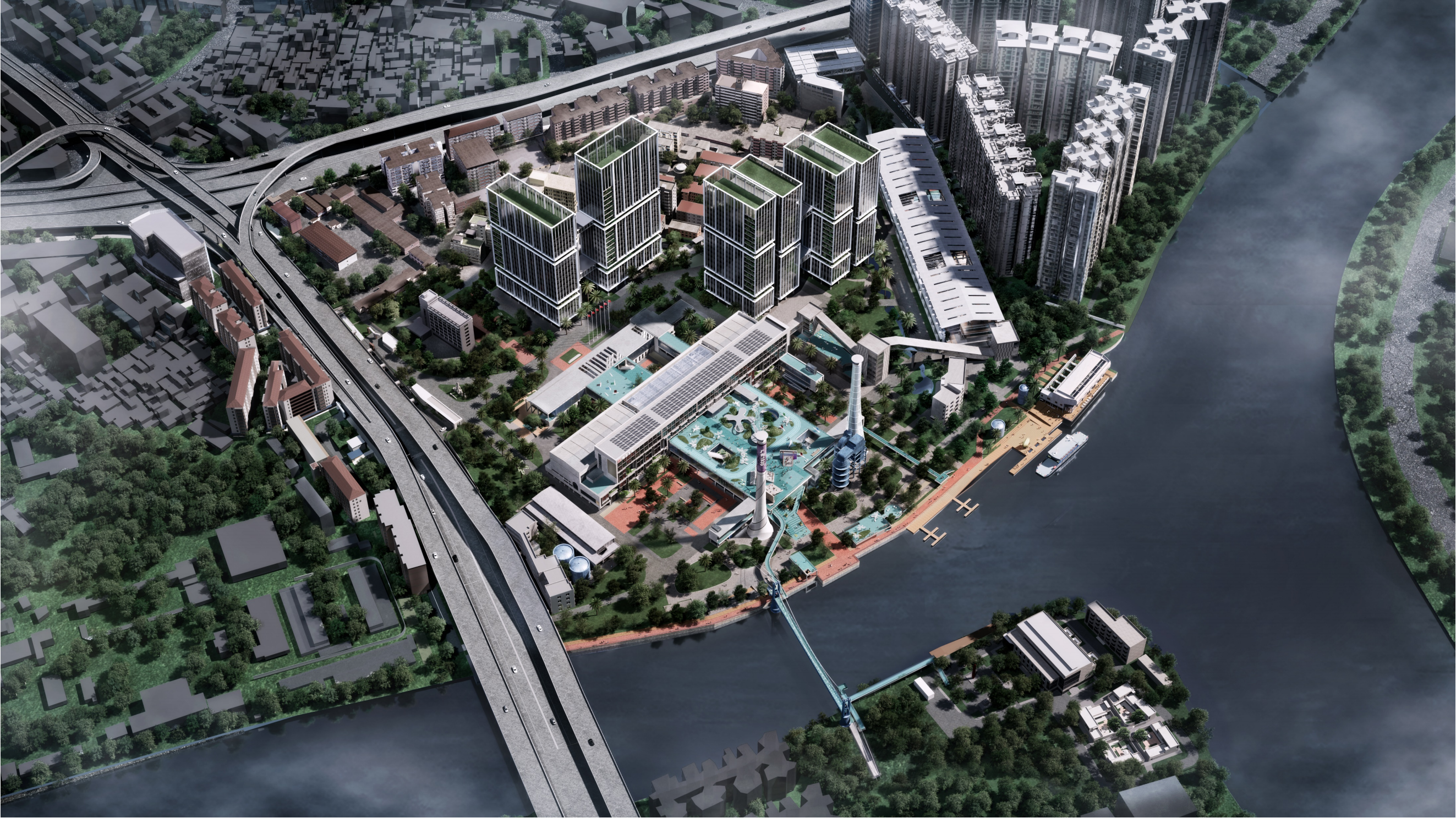 厂区内原有的两座烟囱分别高84米、81米。烟囱底部将改造成咖啡吧,外立面将增设太阳能灯具、LED屏幕,将化身滨江灯塔。