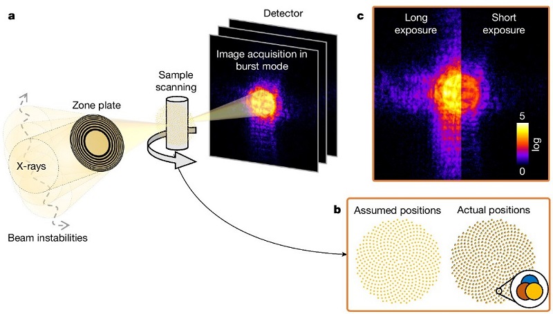 这项技术使X射线光束不是聚焦于样品的某个纳米点,而是让样品在纳米尺度移动,使照射在其上的X射线光束的移动路径形成一个精密网格,网格上的每个点都会记录样品的衍射图案。由于单个网格点间距离小于光束直径,成像区域存在重叠,因此可提供足够多的信息,算法据此能以高分辨率重建样本图像。