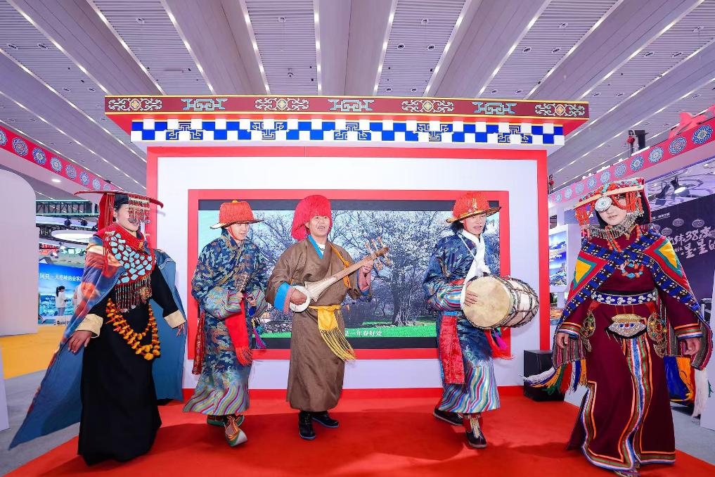 展馆内,让观众们驻足停留的除了智能化的交互场景,还有展现各地文化内涵的各类演出。在西藏展区,华丽的藏族服饰一出场就吸引了观众的目光,悠扬的果沃琴弹唱将观众带到“神山圣湖”。随着文化旅游融合发展,历史悠久的果沃琴弹唱从村庄、剧院走向街道、景区,让更多游客感受到西藏文化的魅力。