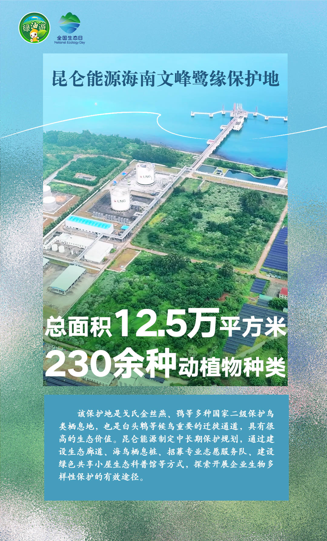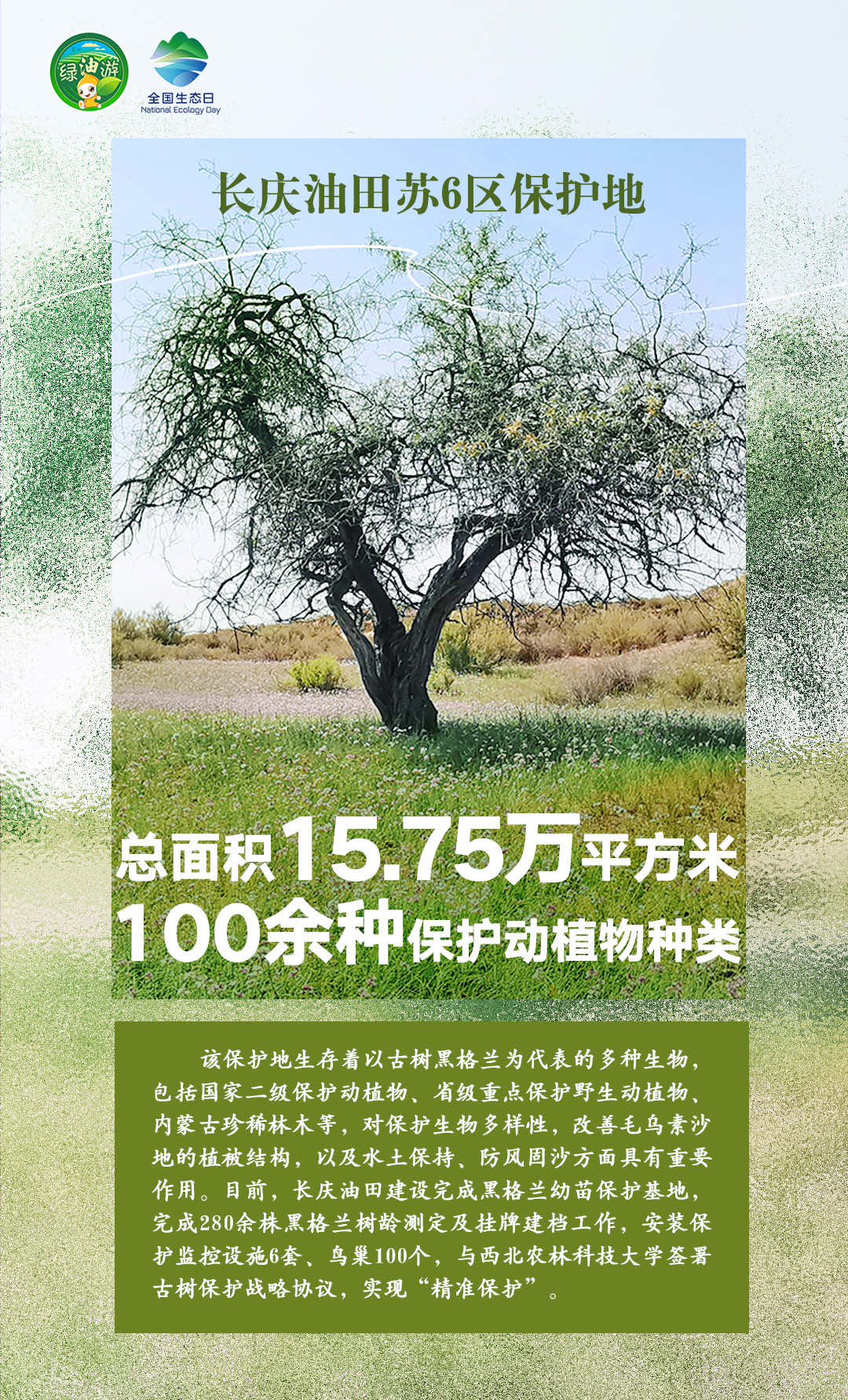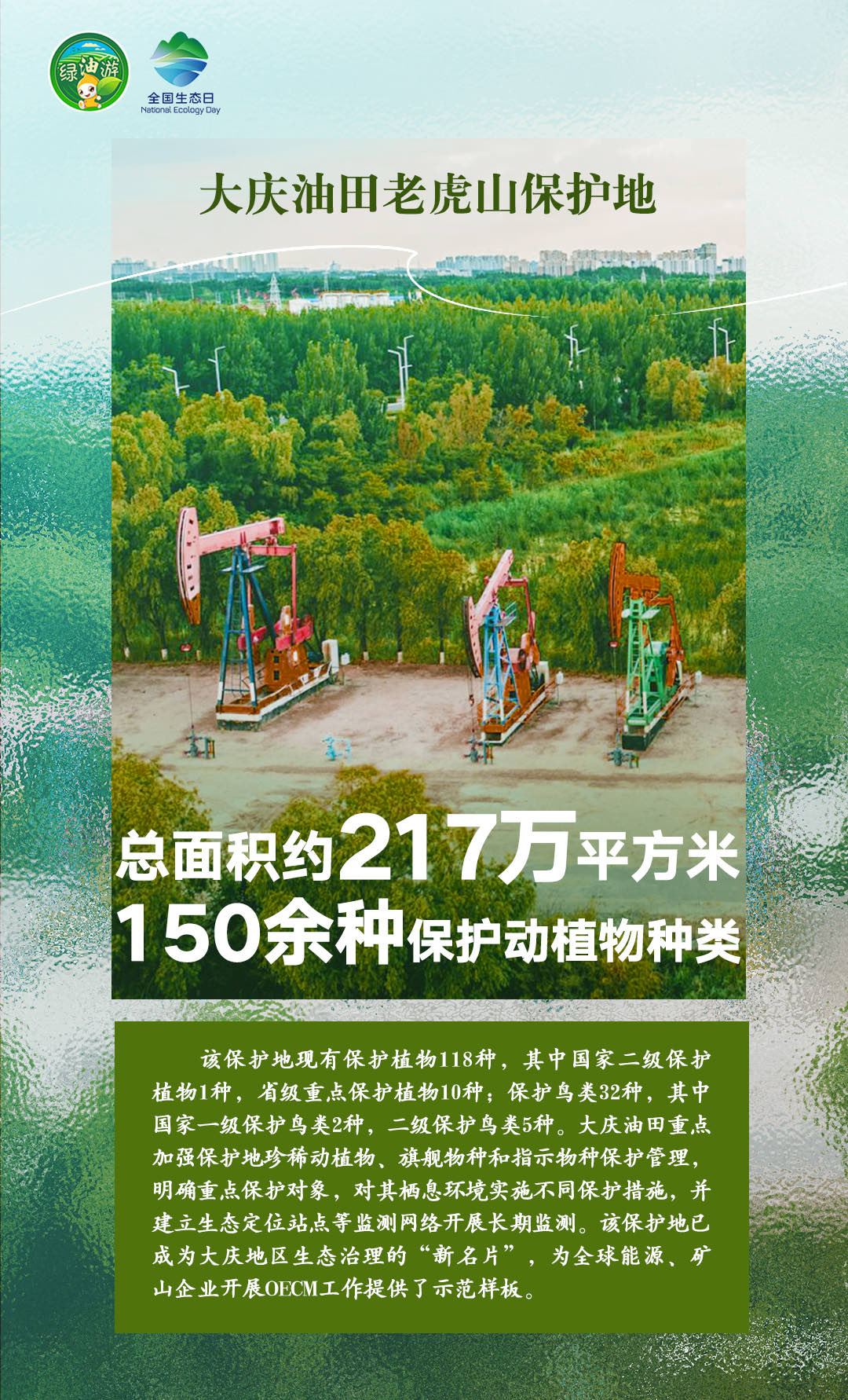 8月15日是第二个全国生态日,当天,作为全球首家开展OECM(其他有效区域保护措施)实践的国际知名企业,中国石油在长庆油田、塔里木油田、昆仑能源海南公司同时设立第二批共7个自主贡献型生物多样性保护地(OECMs),在大庆油田、长庆油田等企业同步建成5个绿色共享小屋,成立9支生物多样性保护志愿服务队。中国石油搭建的生物多样性综合监测系统(一期)也同步上线,为建设人与自然和谐共生的中国式现代化提供石油样本贡献石油力量。