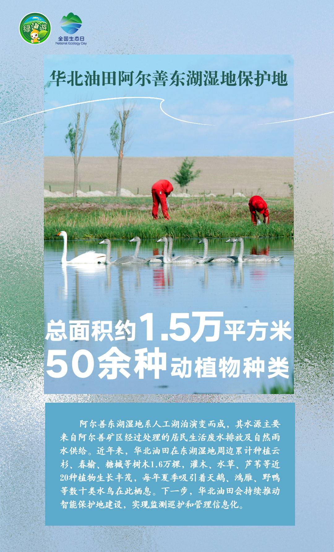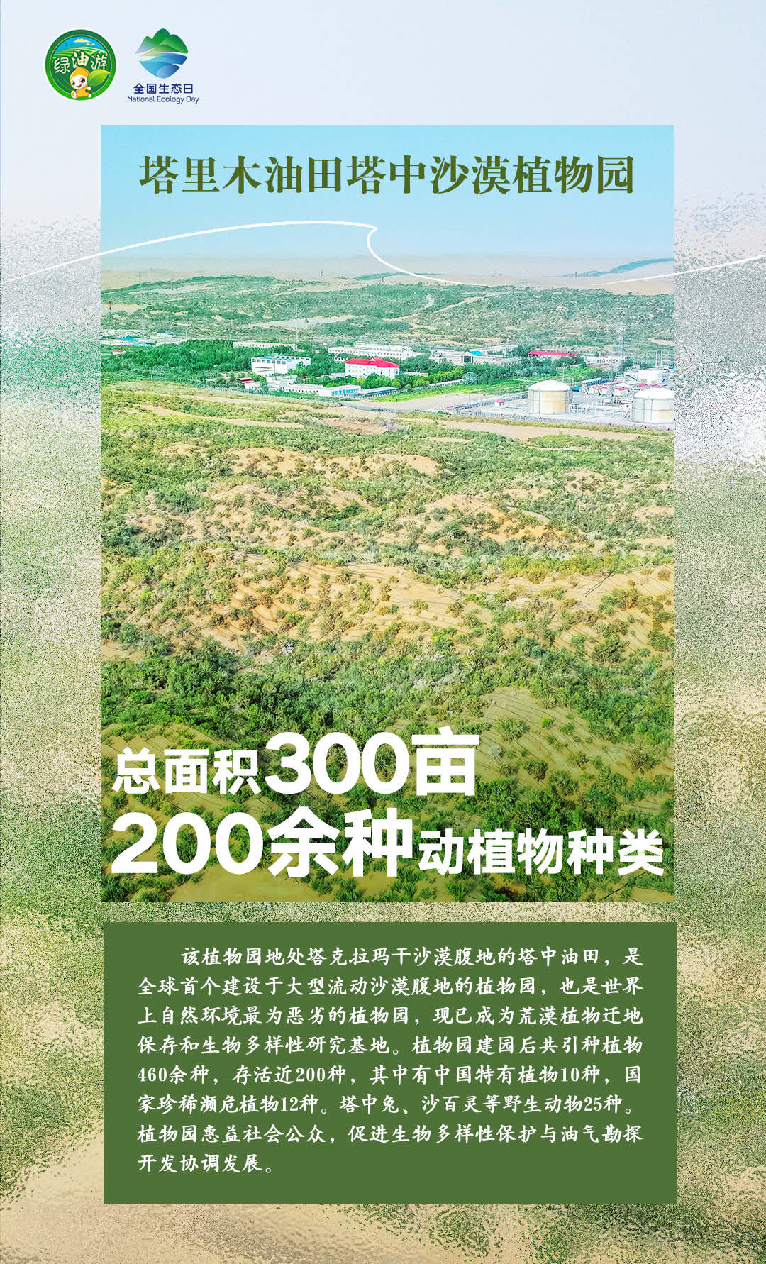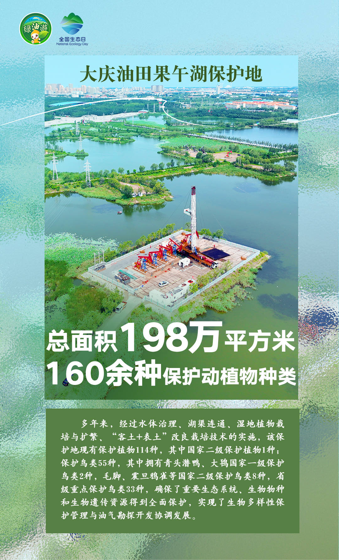 8月15日是第二个全国生态日,当天,作为全球首家开展OECM(其他有效区域保护措施)实践的国际知名企业,中国石油在长庆油田、塔里木油田、昆仑能源海南公司同时设立第二批共7个自主贡献型生物多样性保护地(OECMs),在大庆油田、长庆油田等企业同步建成5个绿色共享小屋,成立9支生物多样性保护志愿服务队。中国石油搭建的生物多样性综合监测系统(一期)也同步上线,为建设人与自然和谐共生的中国式现代化提供石油样本贡献石油力量。