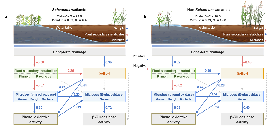 研究发现,尽管短期排水通过增加土壤氧气含量普遍提升了湿地酚氧化酶活性,但是胞外酶活性对长期排水的响应在泥炭藓和非泥炭藓湿地中截然不同。在非泥炭藓湿地中,长期排水通过增加植物次级代谢产物(特别是抑菌酚类)的含量,降低了合成酚氧化酶的微生物丰度,进而导致酚氧化酶活性下降。相反,在泥炭藓湿地中,排水导致富含抑菌酚类代谢产物的泥炭藓被草本植物所取代,进而增强了合成酚氧化酶的微生物丰度,提高了土壤酚氧化酶活性,并进一步增强了水解酶活性。
