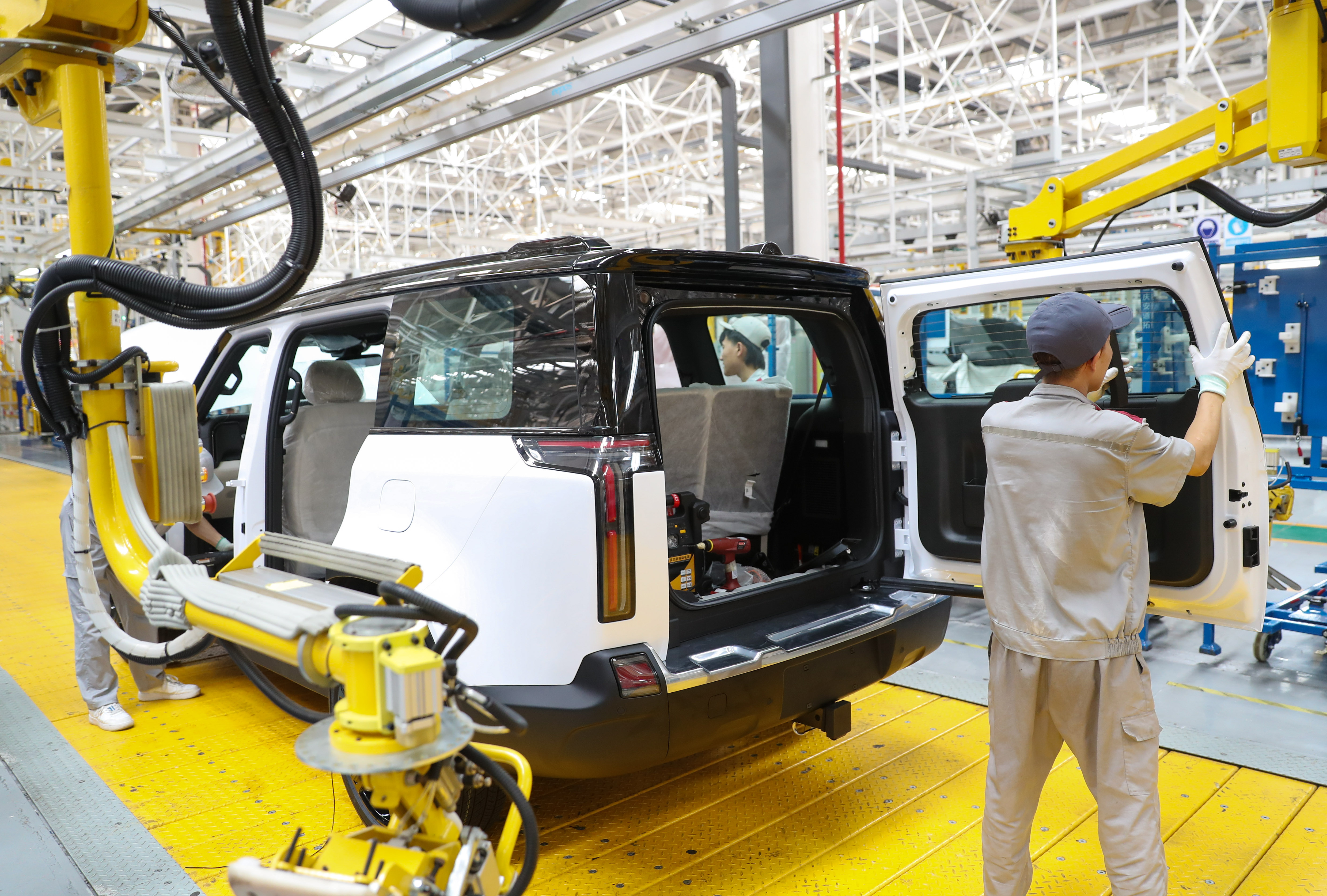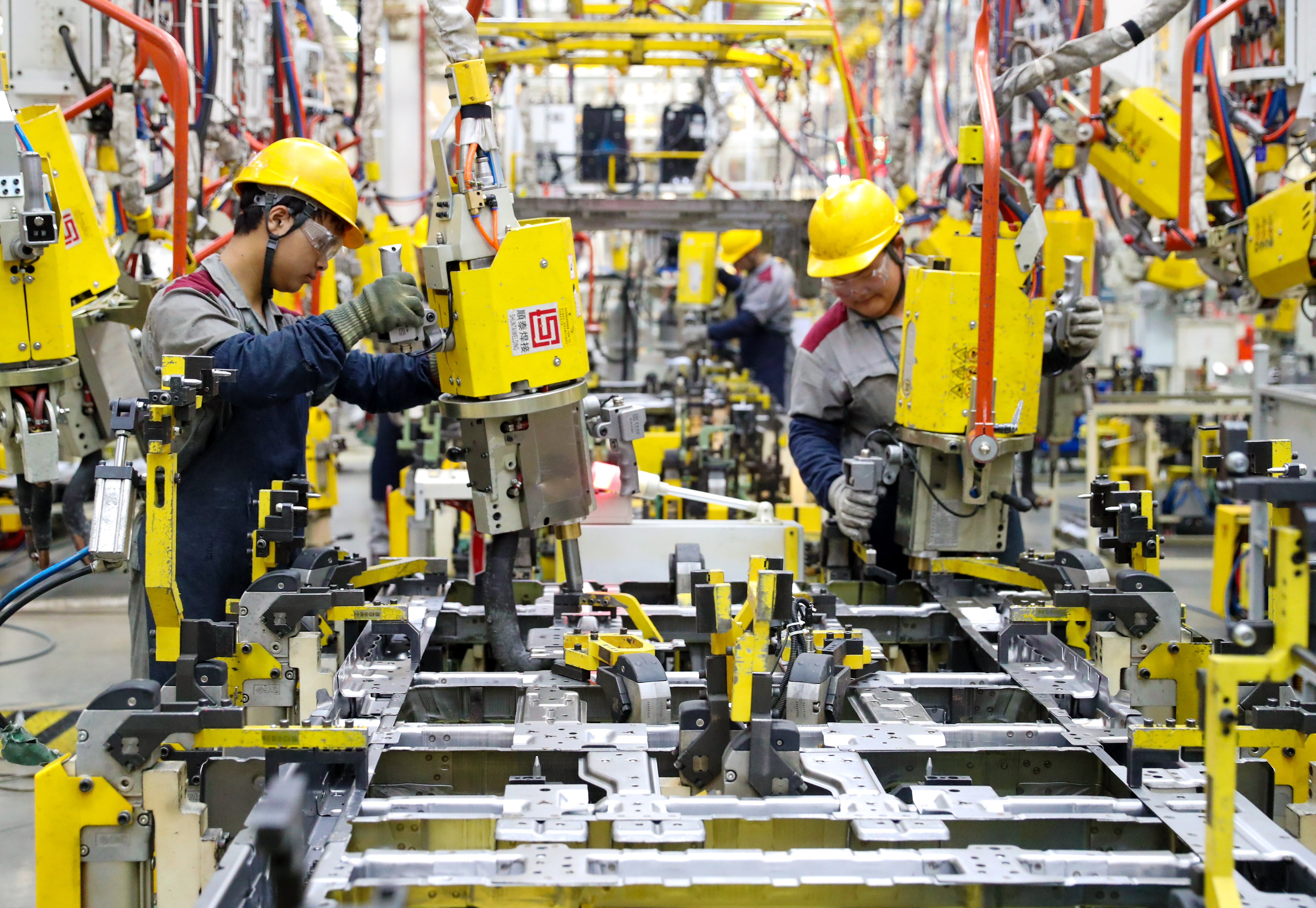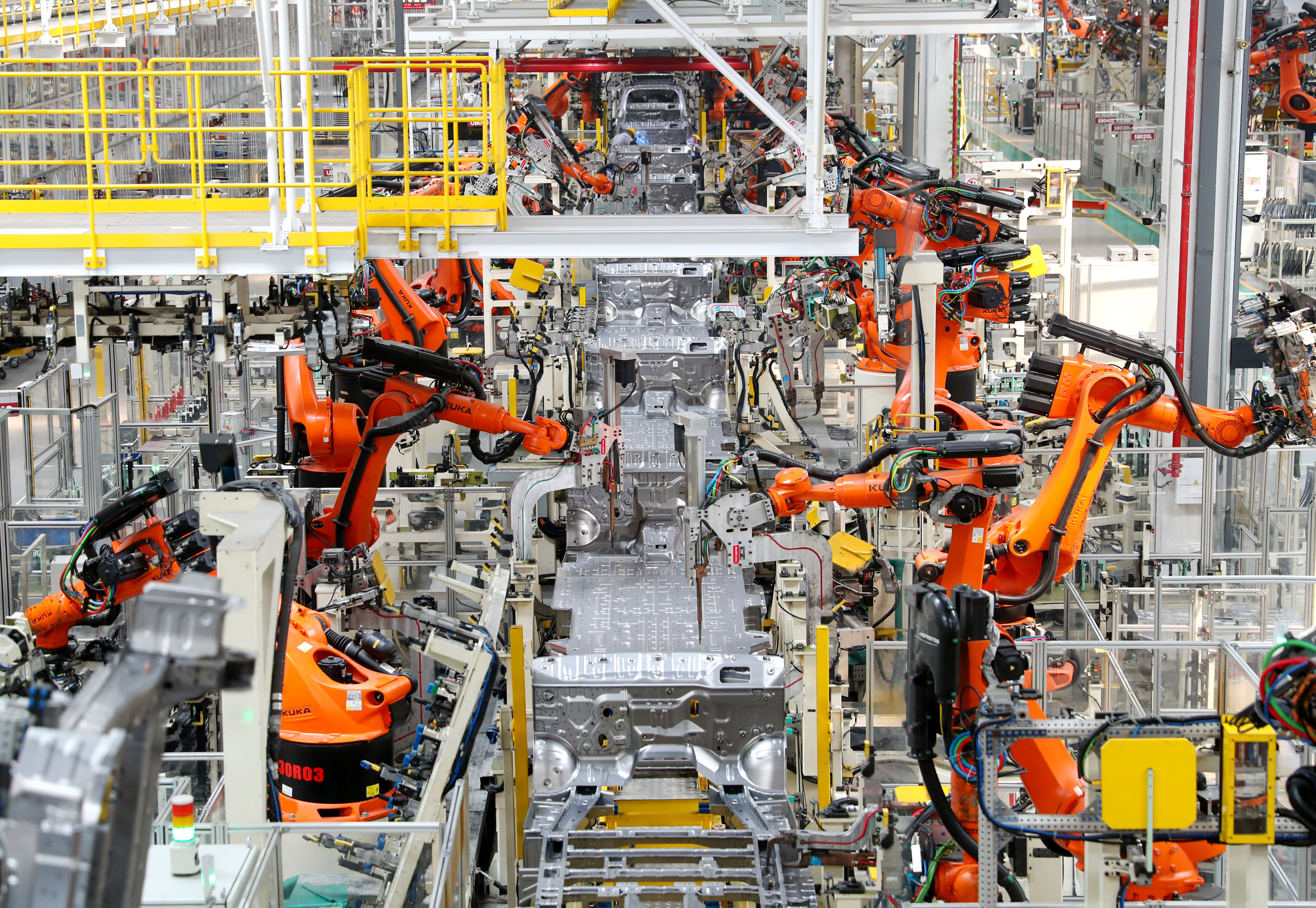 8月17日,位于青岛莱西市的北京汽车制造厂青岛总部基地生产车间内,机械手进行焊接作业,工人加紧生产,新能源汽车生产线上一派繁忙。连日来,莱西市新能源汽车企业订单持续增多,呈现出国内外市场产销两旺良好态势。