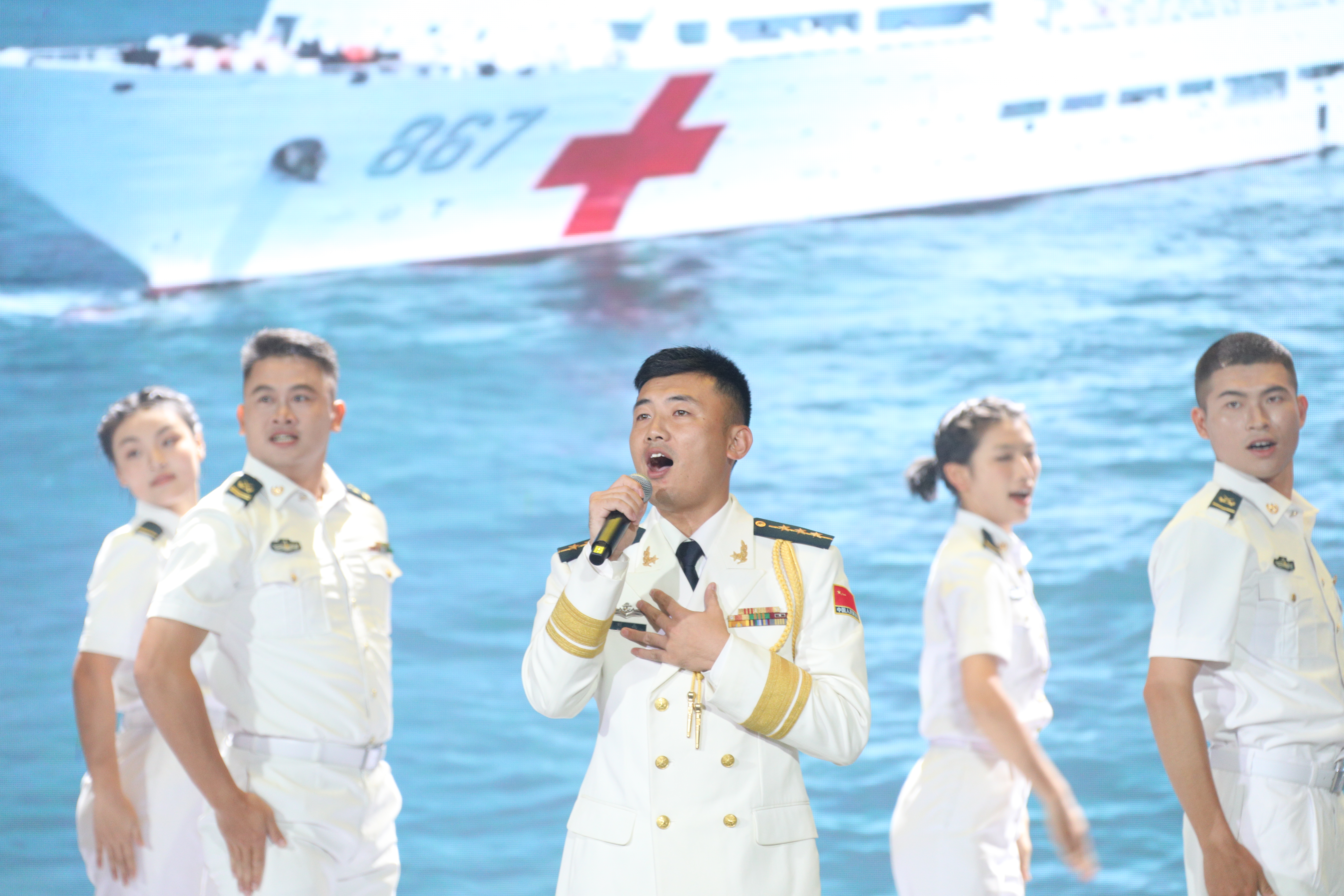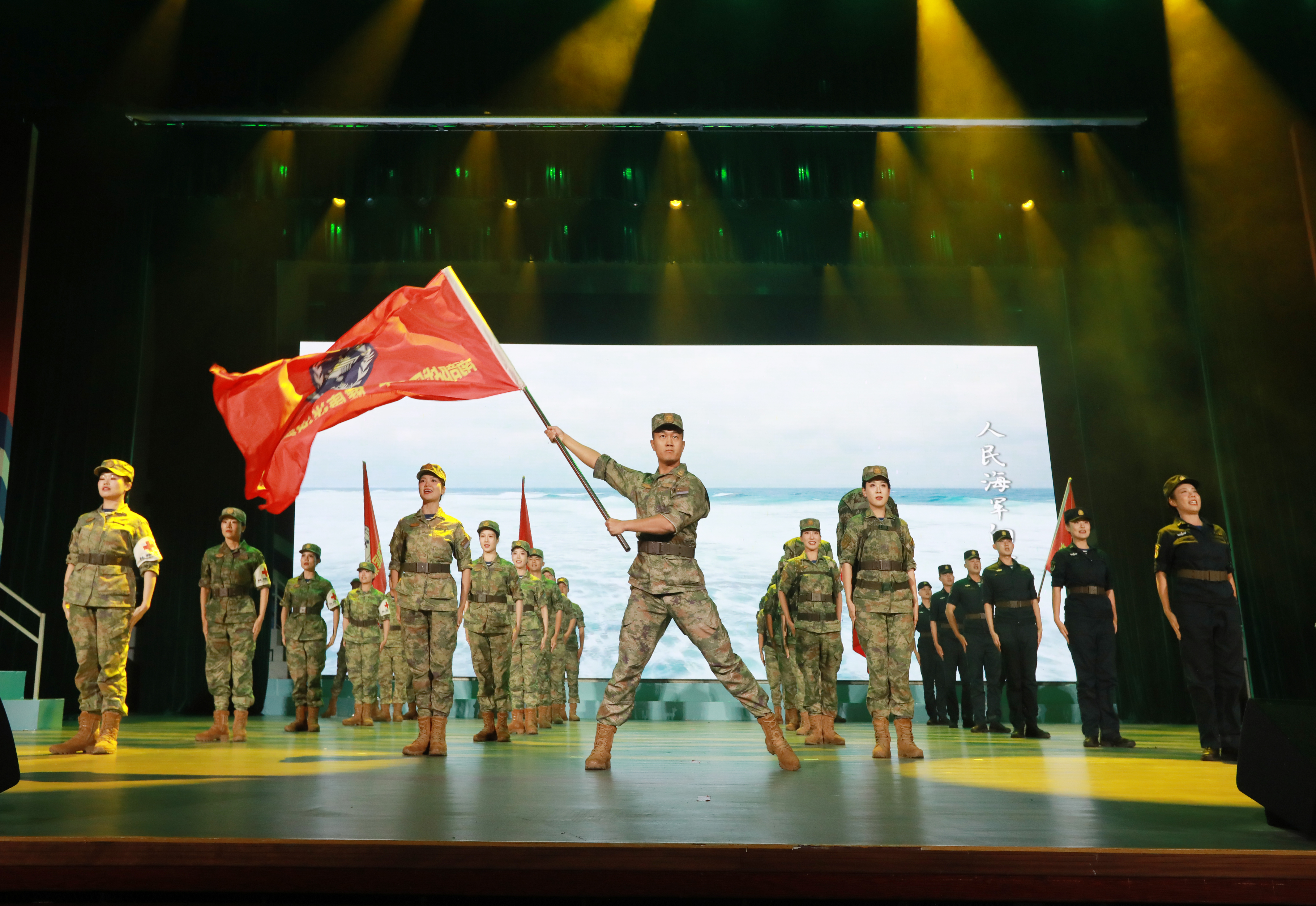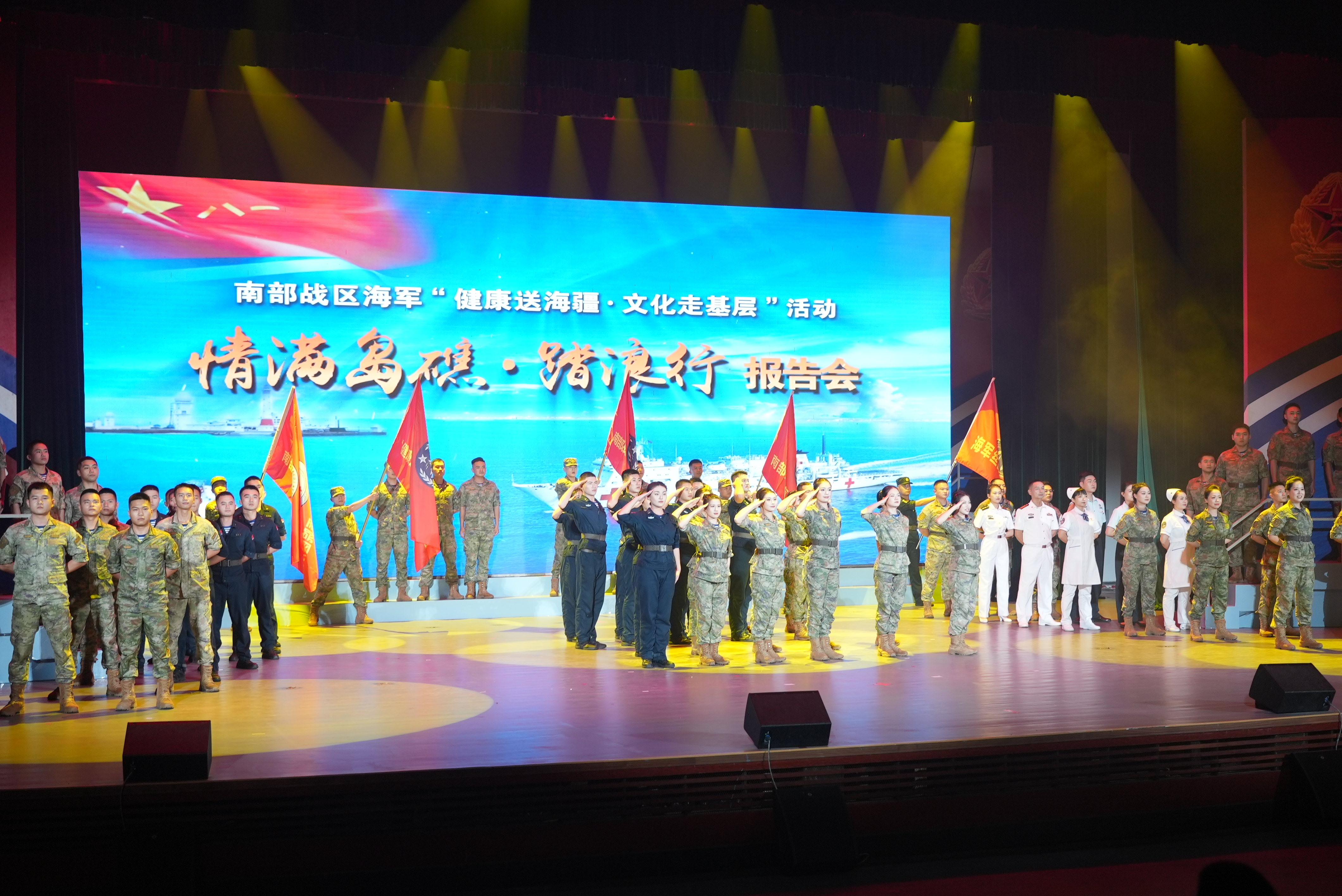 此外,来自舰艇、岛礁、医院等不同单位的官兵代表,精心编排队形动作,巧妙搭配衔接情景,穿插展演歌伴舞、水兵太极拳、情景朗诵等节目,将节目情绪与讲述内容深度嵌合,进一步烘托主题、渲染氛围,让在座的观众,身未在岛礁,心同受感染,形成联动教育效果,进一步激发广大官兵扎根南海、守卫南海、建功南海的坚定决心。报告会在《南部战区海军向前方》的歌声中结束。
