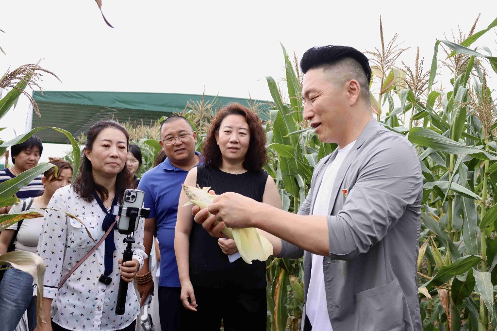 延庆区大庄科乡东王庄村党支部书记王有军带领观众走进玉米种植园区,一边讲述种植环境和技术,一边亲手采摘玉米,用实际行动介绍“从田间到餐桌”的全过程。