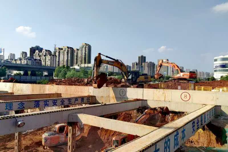 为保证施工过程安全受控,项目部严格按照施工方案要求,对已完工的冠梁挡墙、混凝土支撑等进行高强度检测,满足要求后,启动基坑开挖程序。在施工现场,7台大型挖掘机接力作业,有序推进。杜涛介绍,后续施工项目部将严守安全生产底线,严格落实现场安全管控各项要求,强化各阶段风险源辨识,严格按图施工,压实主体责任。