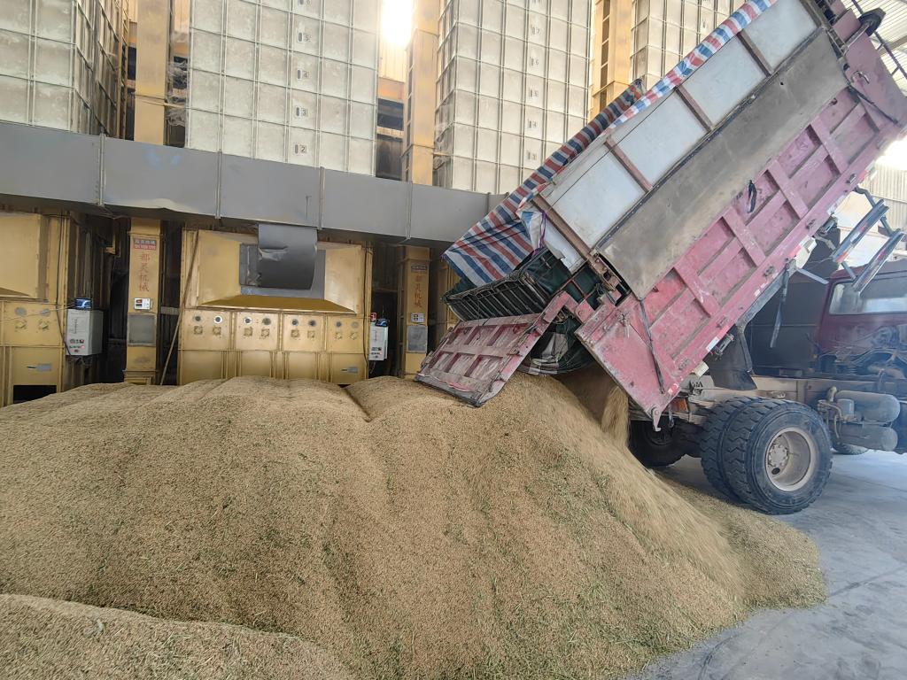 下午5时许,刘道旭就马不停蹄地把刚收割的稻谷运往太和镇粮食收购中心。他引导农用车停在卸载区。随后车斗缓缓升起,稻谷倾泻而下,堆成一座座小山。