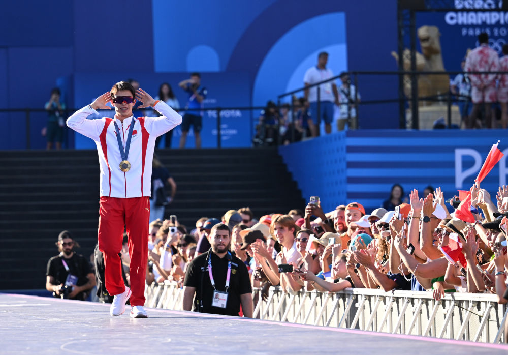 在运动员大巴车上,全红婵向外国运动员展示刚刚获得的金牌,在视频里搞怪。在冠军公园,龙道一戴着墨镜,随着现场的音乐迈着颇具动感的步伐,有节奏地高举双手打出拍子,瞬间点燃了现场的气氛,“说唱歌手”的兼职身份也瞒不住了。