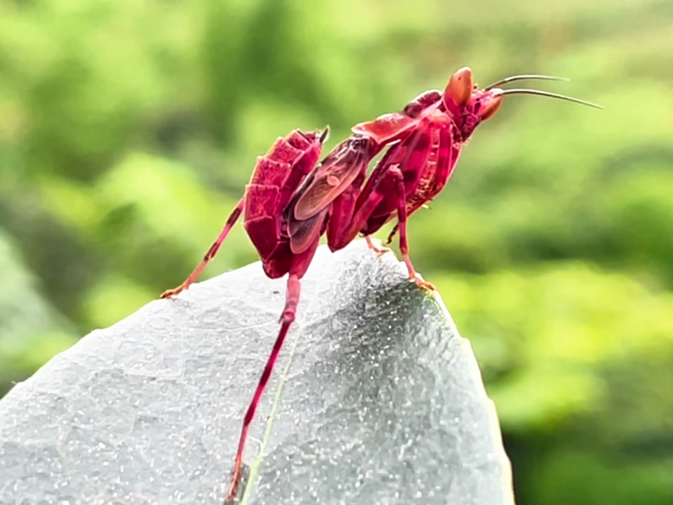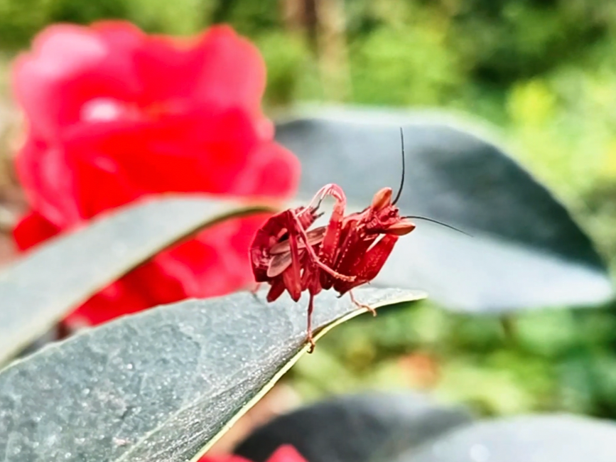 “早上我起来给花浇水,看到一只虫子爬在花瓣上,刚开始没在意,可仔细一瞧,它是红色的,与常见的螳螂不同。我赶紧打电话给林草部门的工作人员,让他们来看看是不是新物种。”黎明乡窑房村村民李康说。