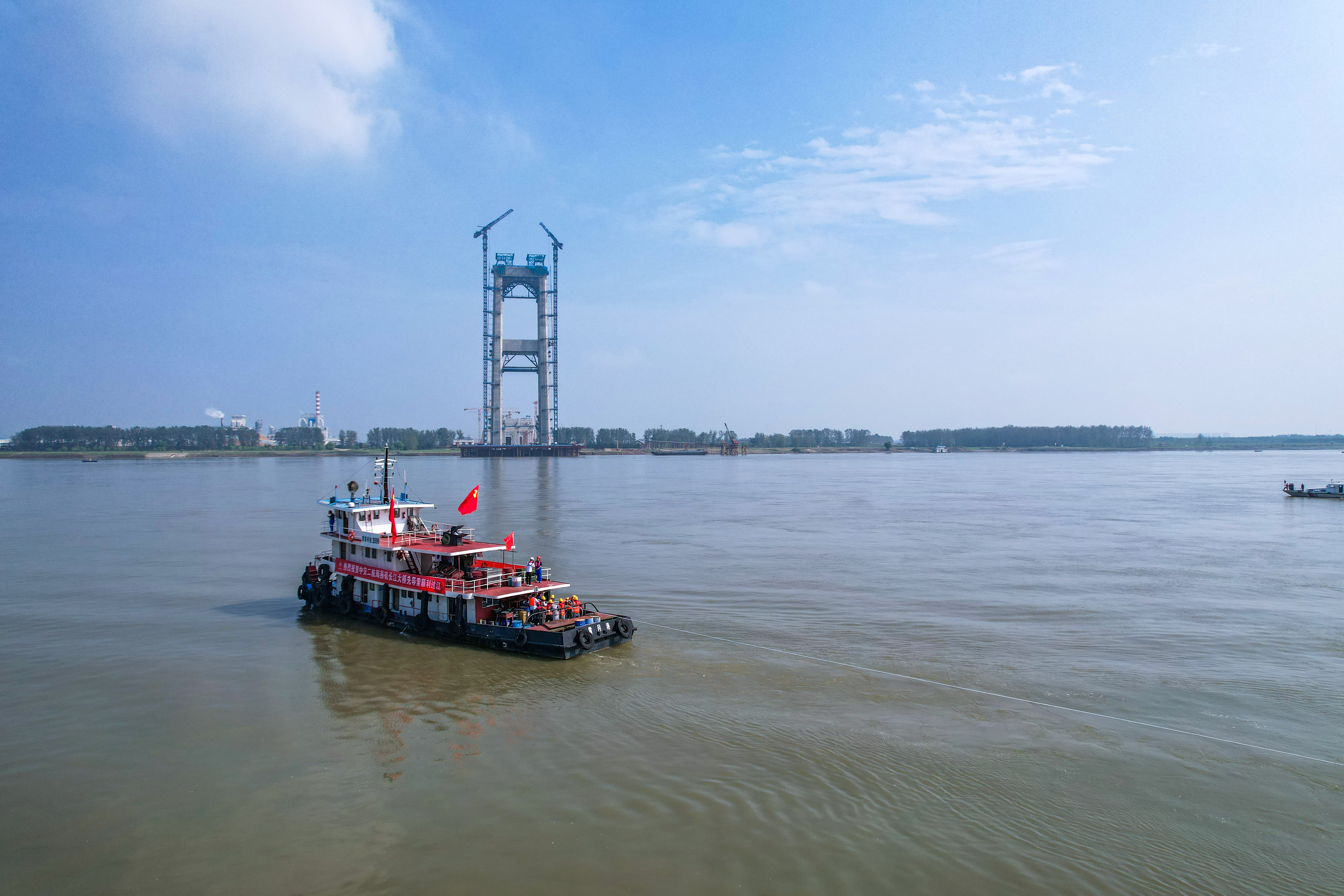 8月29日9时08分,随着三声清脆的汽笛声响起,拖轮牵引着先导索从湖北鄂州侧南塔驶向黄冈侧北塔。随后,两岸塔顶卷扬机缓缓启动,将先导索从水面一步步拉升至预定高度,标志着由湖北交投投资建设、中交二航局承建的湖北燕矶长江大桥成功跨越1860米江面,完成先导索架设,南北双塔实现“会师”。