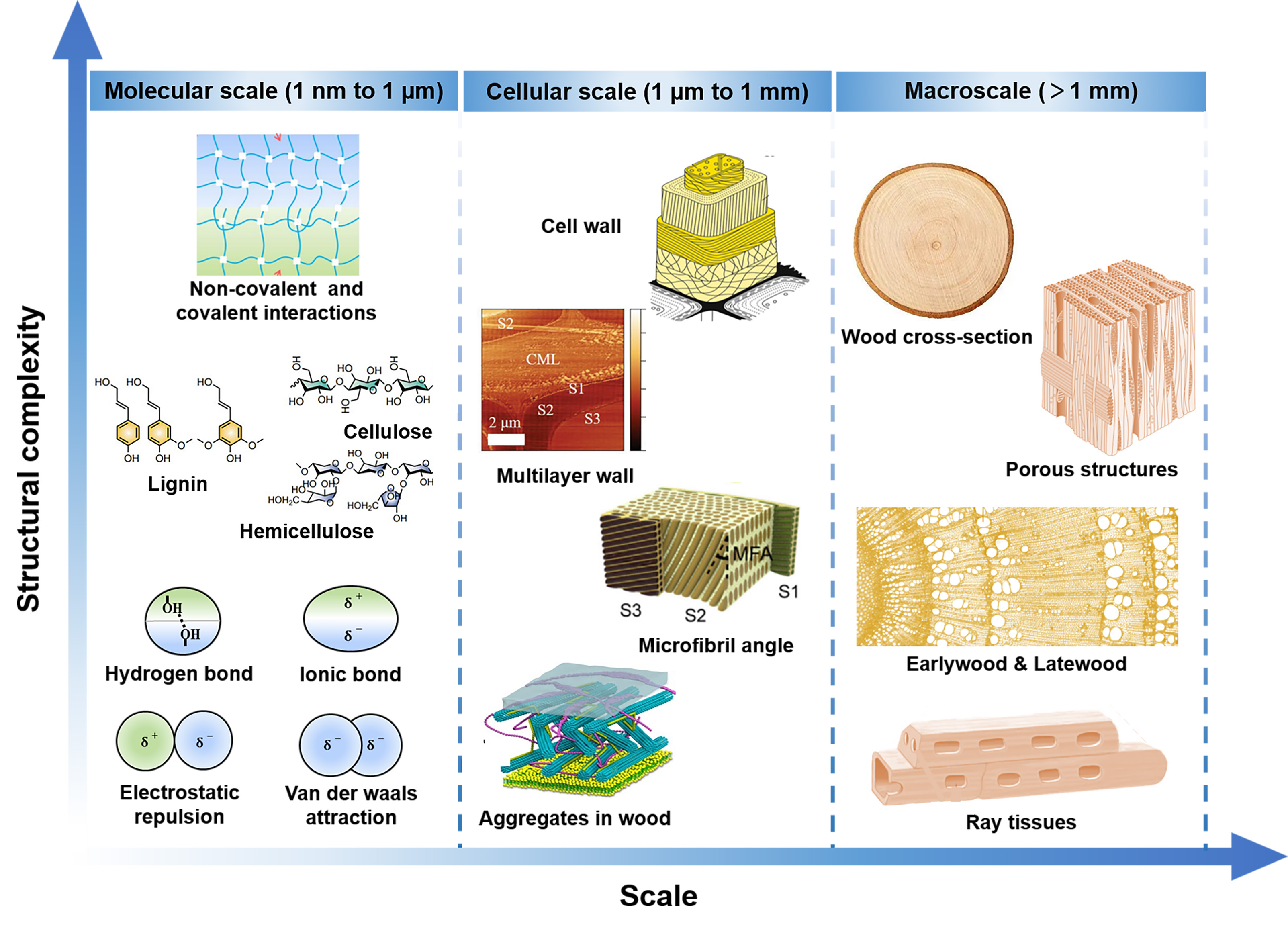 天然木材虽然本身具有一定的弹性,但由于弹性极限范围较小,无法满足应用需求。近年来,研究者们通过对木材的化学组分和细胞壁结构进行精细调控,成功开发出了木弹簧、木基弹性气凝胶、木海绵等多种新型弹性材料,这些新材料显著增强了木材的压缩回弹性。然而,木基弹性材料的压缩回弹性与木材多层级结构之间的构效关系尚待进一步明确。