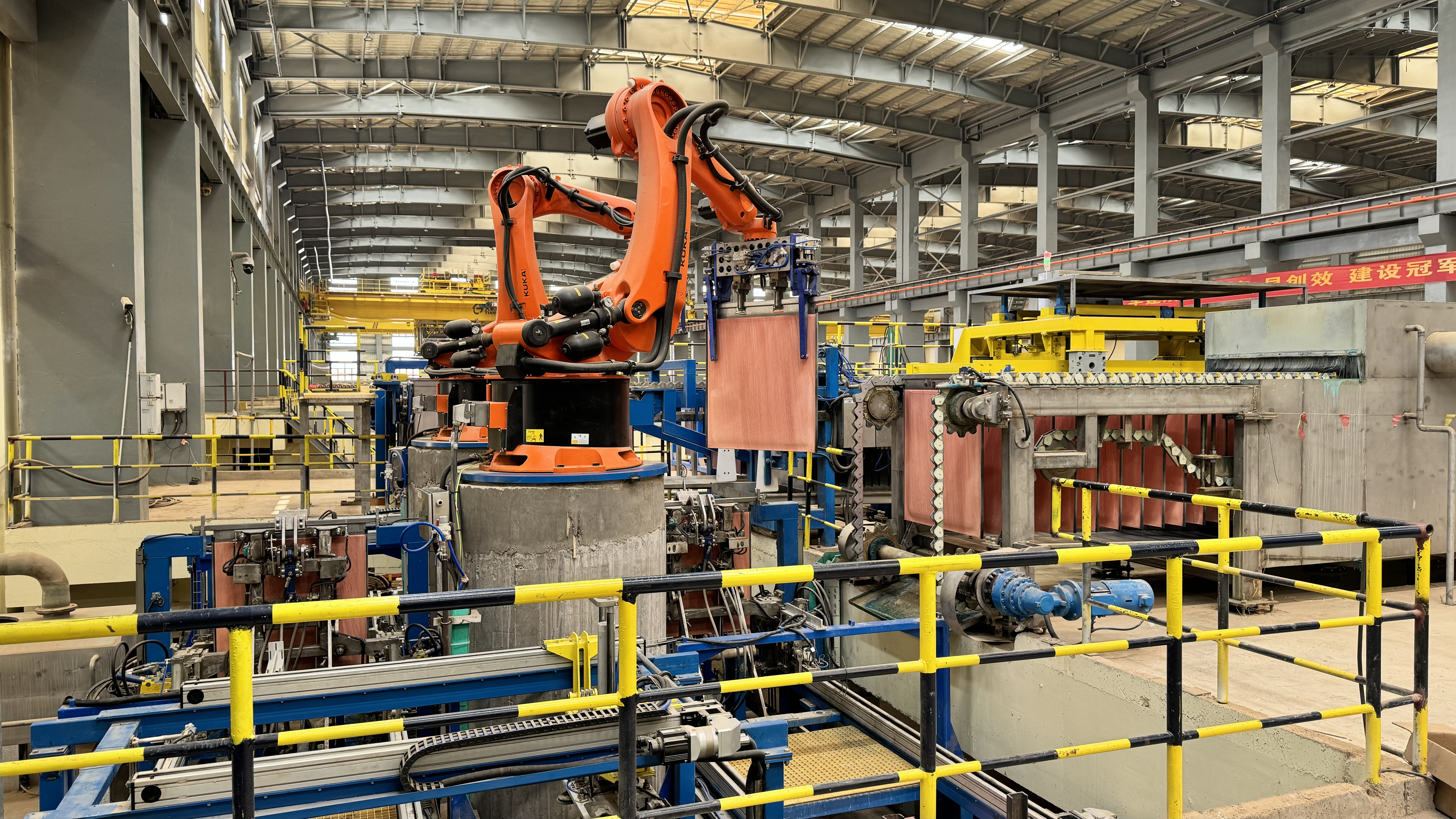 走进刚刚投产的西南铜业生产现场,只见阴极剥片机器人灵活转动,宛如人手一样,精确无误地剥离出阴极铜板,机械臂抓起铜板,放置、打捆,动作一气呵成。车间外的堆场上,铜板整齐地码放着,在阳光下折射着金色的光芒。