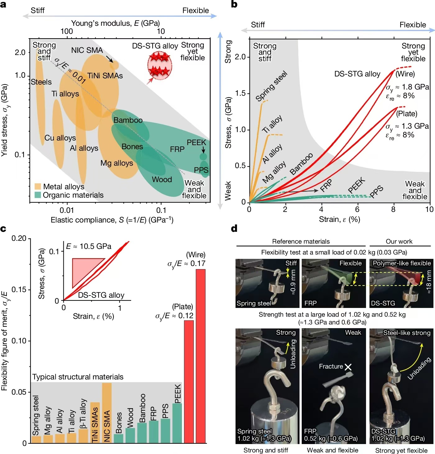 该金属“既强且柔”的特性能够在-80℃到+80℃的宽温域内保持,不仅如此,该金属在大应变下仍具有出色的抗疲劳特性。这些优异特性使得该合金有望在变形飞行器、超级机器人、人工器官等未来技术领域得到重要应用。