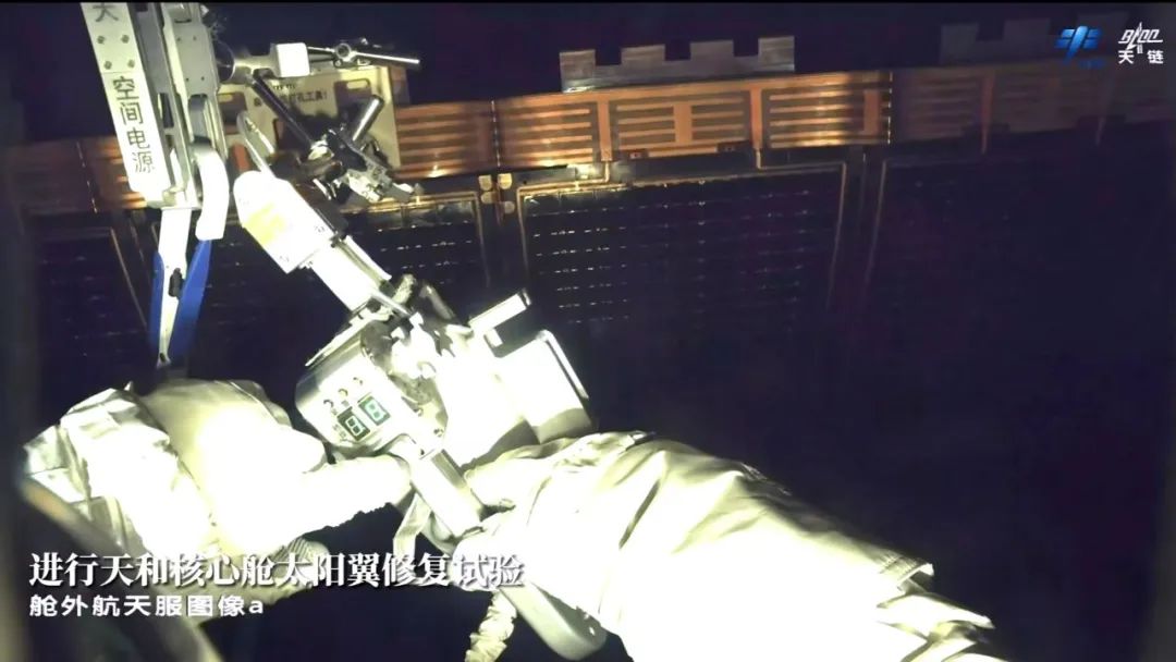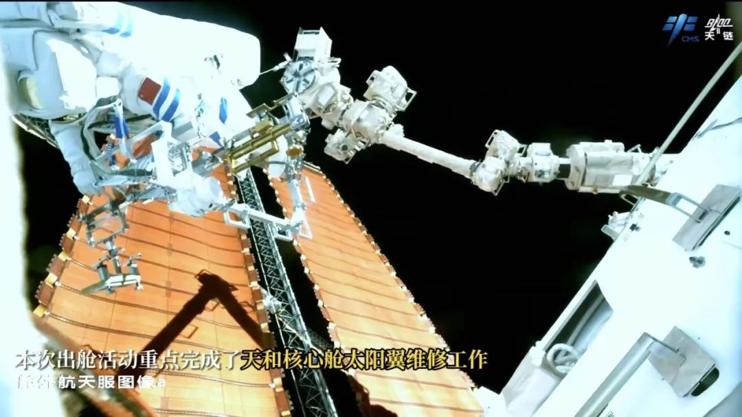 2023年12月21日,经过约7.5小时的出舱活动,神舟十七号航天员汤洪波、唐胜杰、江新林密切协同,在空间站机械臂和地面科研人员的配合支持下,开展了天和核心舱太阳翼修复试验等既定任务,圆满完成首次空间站舱外试验性维修作业。