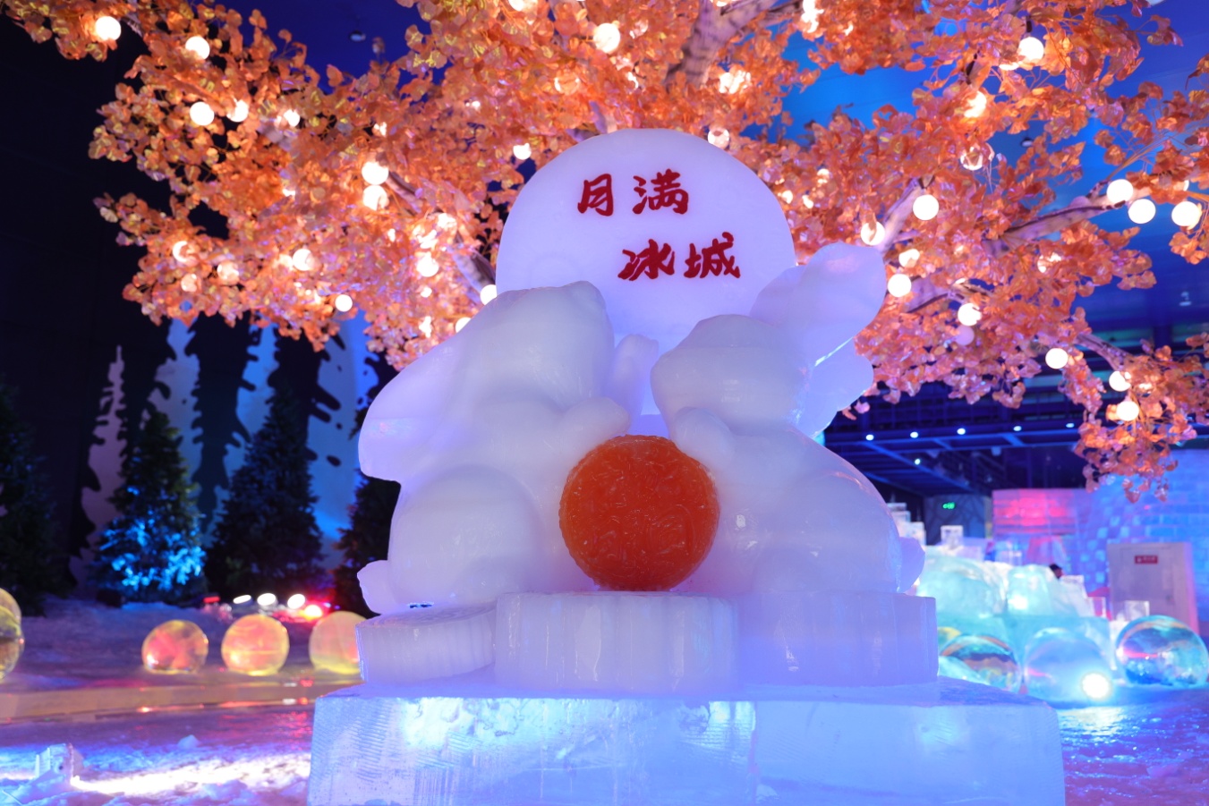 全新雕刻的“玉兔望月”,由一轮圆月、两只惟妙惟肖的望月玉兔和一枚月饼组成;圆月上雕刻着“月满冰城”,月饼上刻有“花好月圆”。整座冰雕取“天上圆月满,人间庆团圆”之意,代表着哈尔滨冰雪大世界用极致冰情雪韵,祝福全国人民中秋快乐、阖家幸福安康。