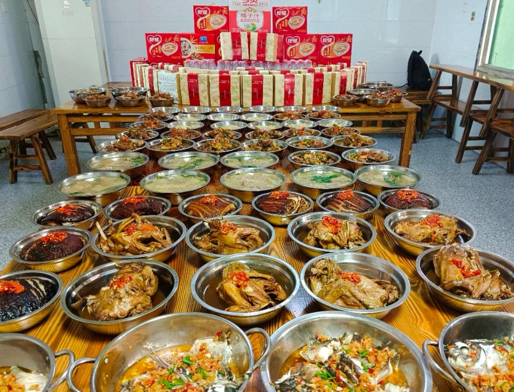 夏天曾遭受洪涝灾害的湖南岳阳华容县,团洲乡敬老院安置点准备了十桌饭菜,每桌十个菜品,鸡、鱼、肉等主菜已经备好,就等大家入席。