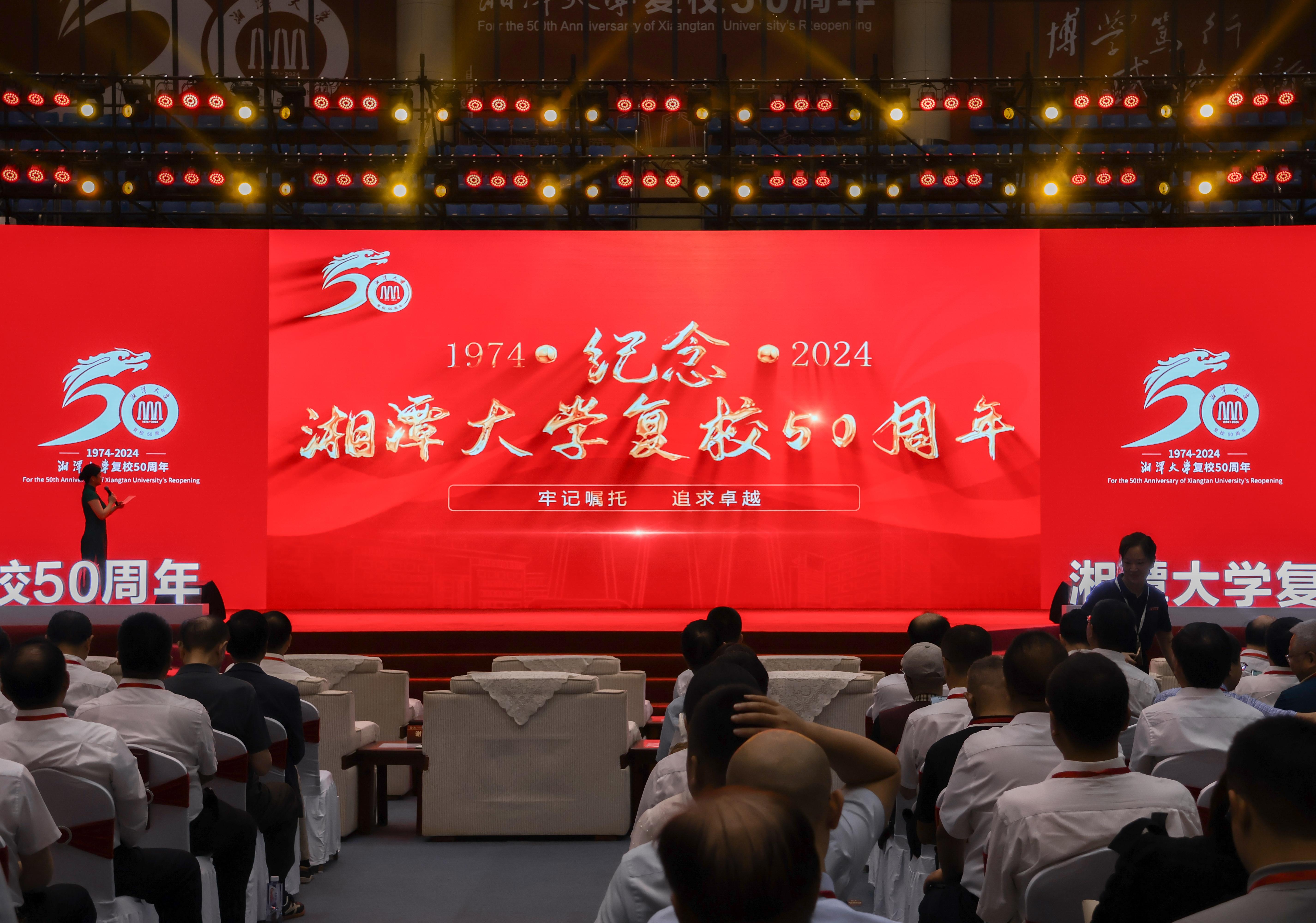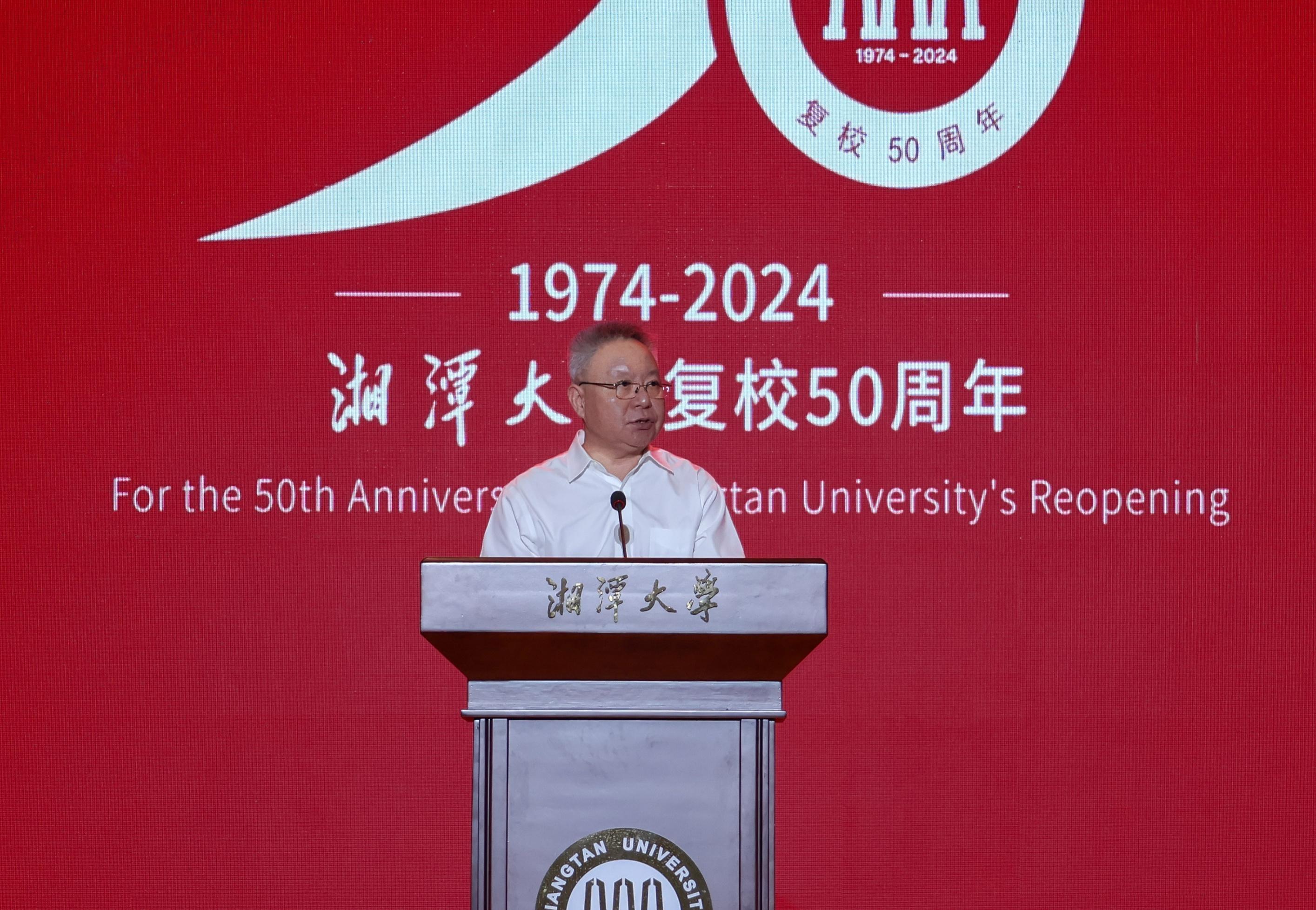 何光彩代表教育部对湘潭大学复校50周年表示祝贺。湖南省政协副主席、湘潭大学校长潘碧灵,中南大学党委书记易红,中国科学院院士周向宇在大会上致辞。潘碧灵表示,奋进新时代,湘潭大学将坚守社会主义办学方向,办好党和人民满意的教育,建设一支师德高尚、锐意进取的高素质创新型师资队伍,培养更多具有深厚家国情怀、堪当复兴重任的优秀人才,着力实现重大原创性成果产出和关键技术突破,为建设科技强国贡献湘大力量。