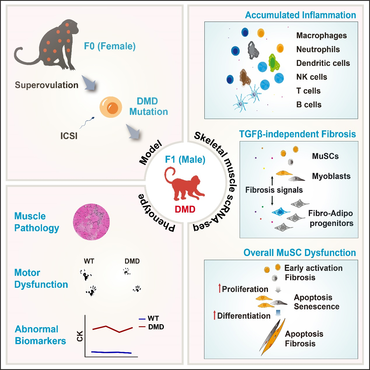 昆明理工大学陈永昌、季维智团队经过近8年的努力,利用与人类高度相似的非人灵长类动物,成功培育了F1代杜氏肌营养不良症猴模型。基于这一新模型,研究团队利用单细胞测序技术,揭示了严重的细胞缺陷是早期肌肉组织病变和再生异常的关键原因,并深入解析了该阶段肌肉组织中单核细胞的变化,尤其是免疫细胞的急剧增加,使肌细胞生存环境恶化,表明抑制炎症反应在治疗中的重要性。同时,该模型也清晰地显示了成纤维及成脂肪祖细胞的纤维化过程,为研发针对杜氏肌营养不良症的新药提供了理论依据。